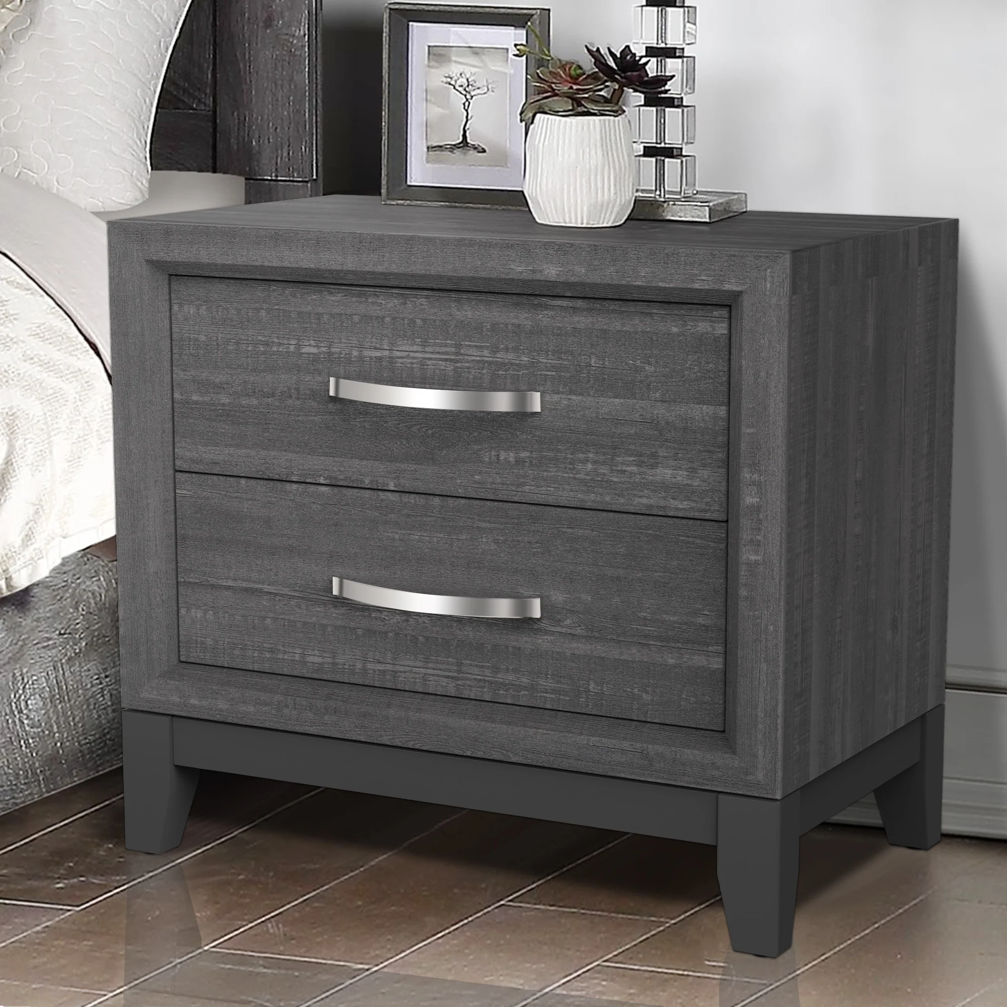 Contemporary Grey Solid Wood 2-Drawer Nightstand End Table