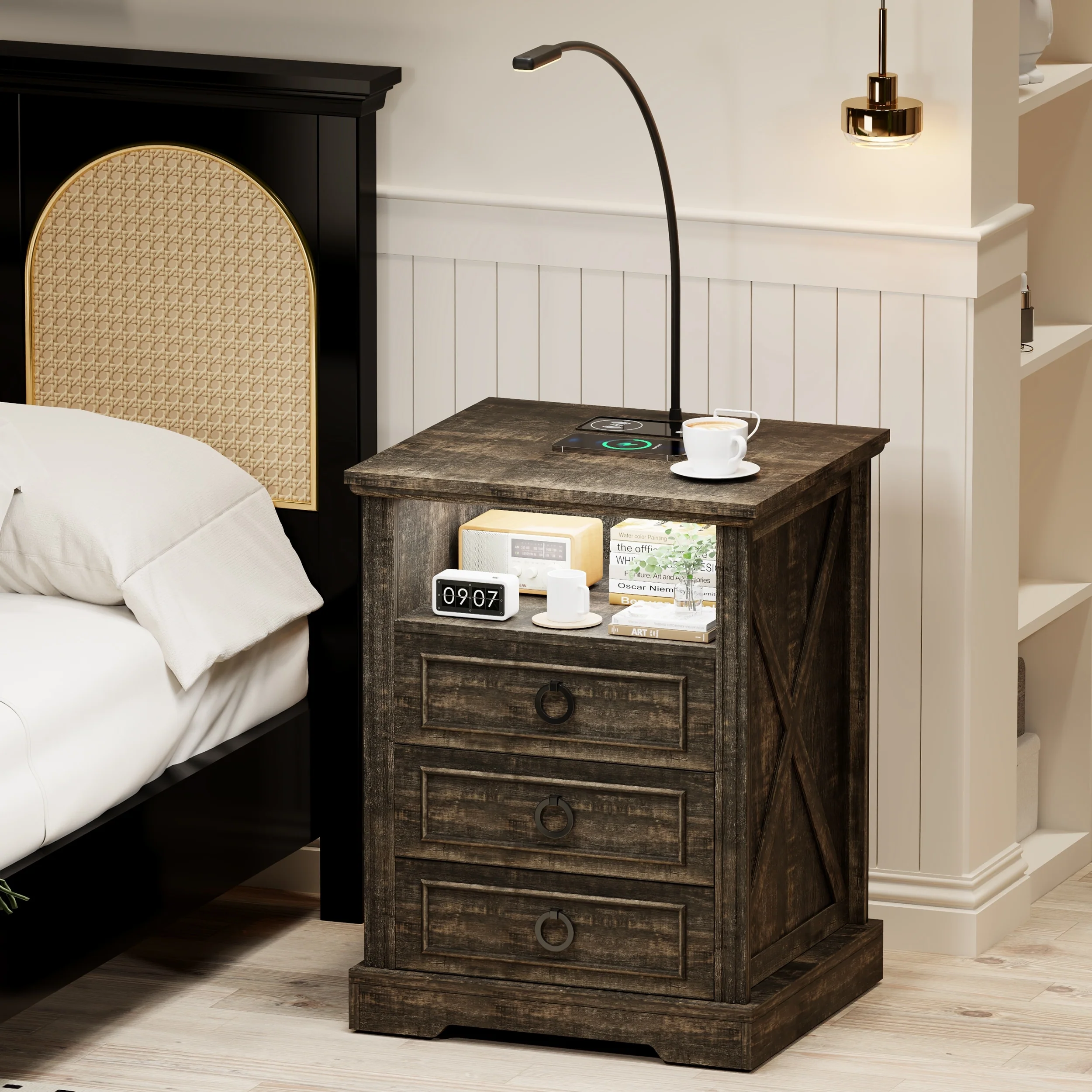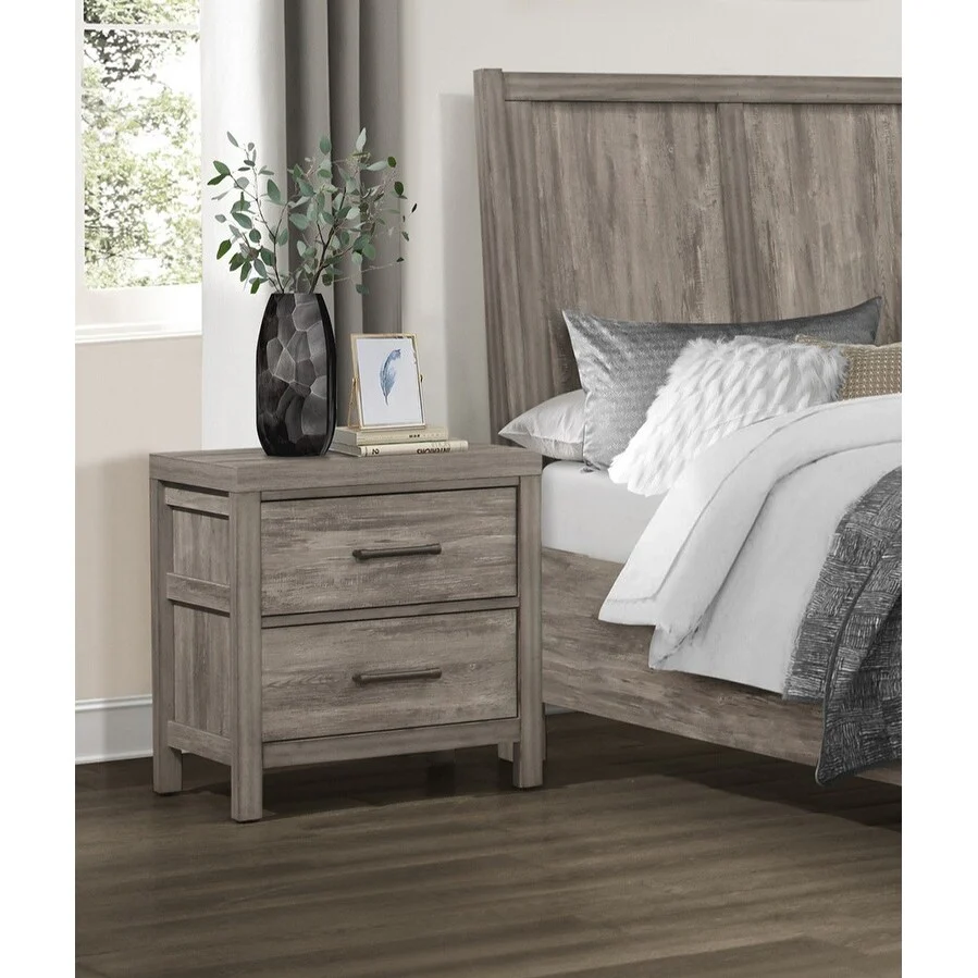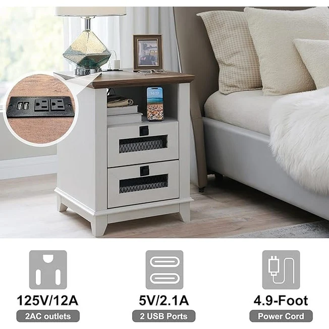 Isla Nightstand, 2 Drawers, 2 USB, Brown Wood Top, Rustic Whitewash