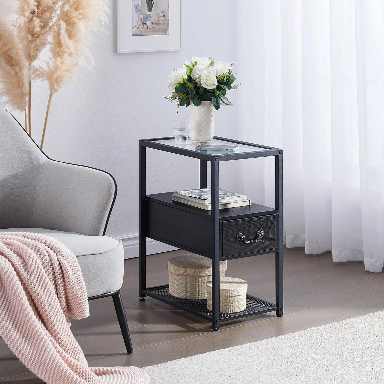 VECELO 1-Drawer Modern Narrow End Table with Glass Top