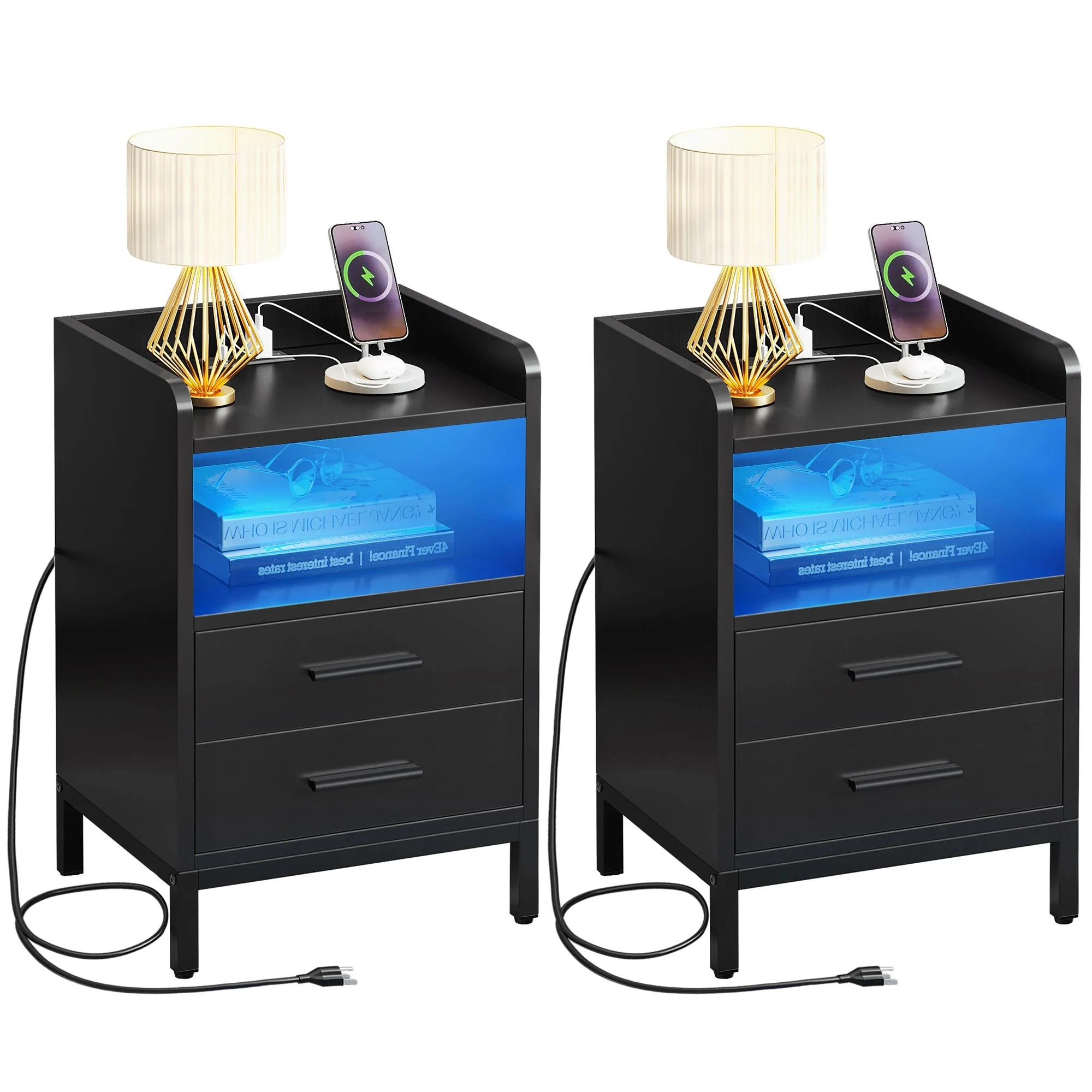 Nightstand Charging Station LED Lights End Table 3 Drawers