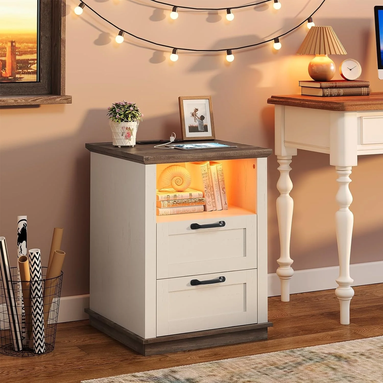 Farmhouse Nightstand with Charging Station 3-Tier Bedside Table