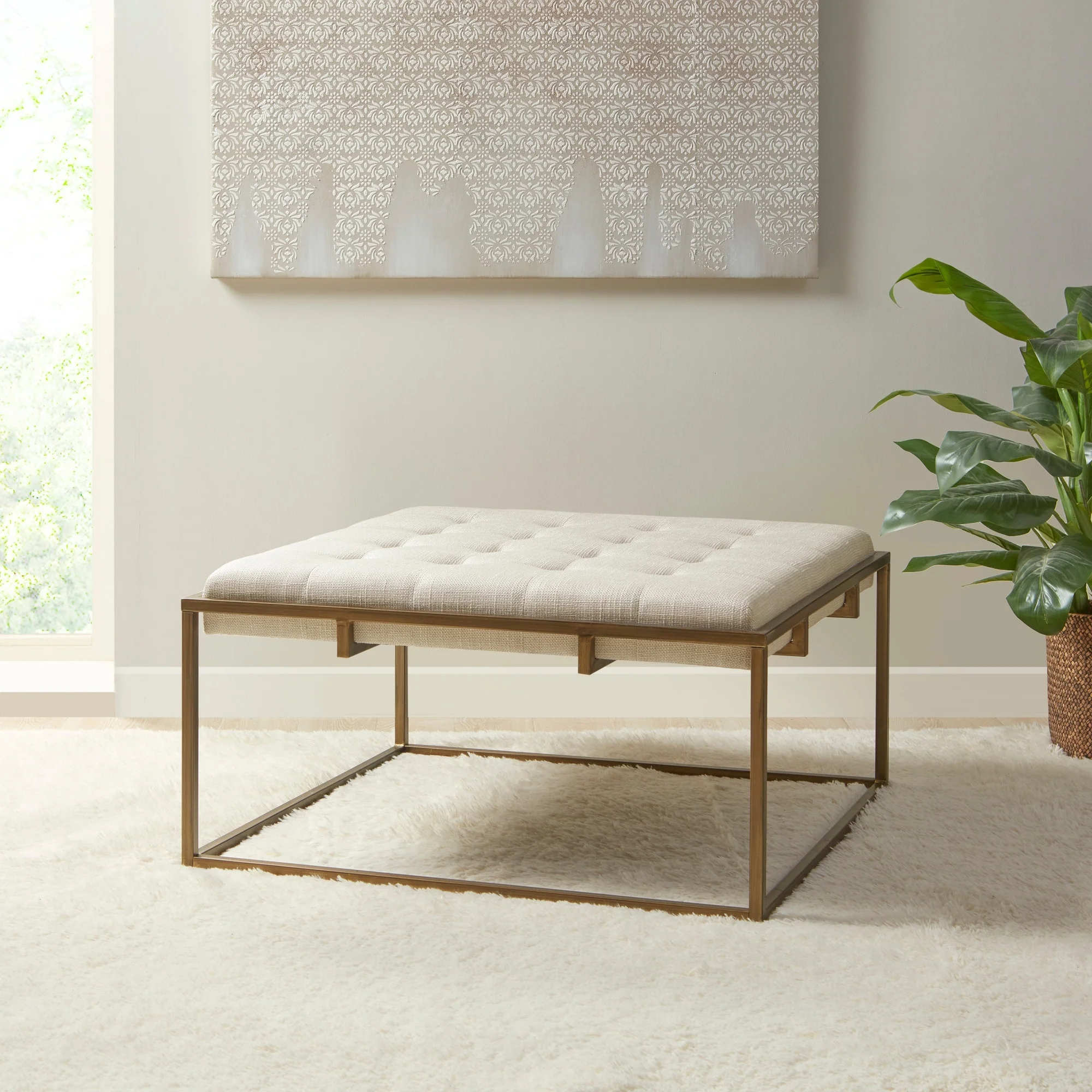 Light Beige Linen Rectangle Button-Tufted Ottoman