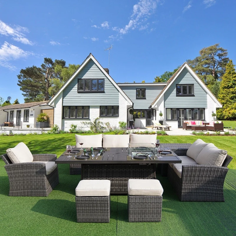 7-Piece Patio Sofa Set with Firepit and Ice Container Dining Table