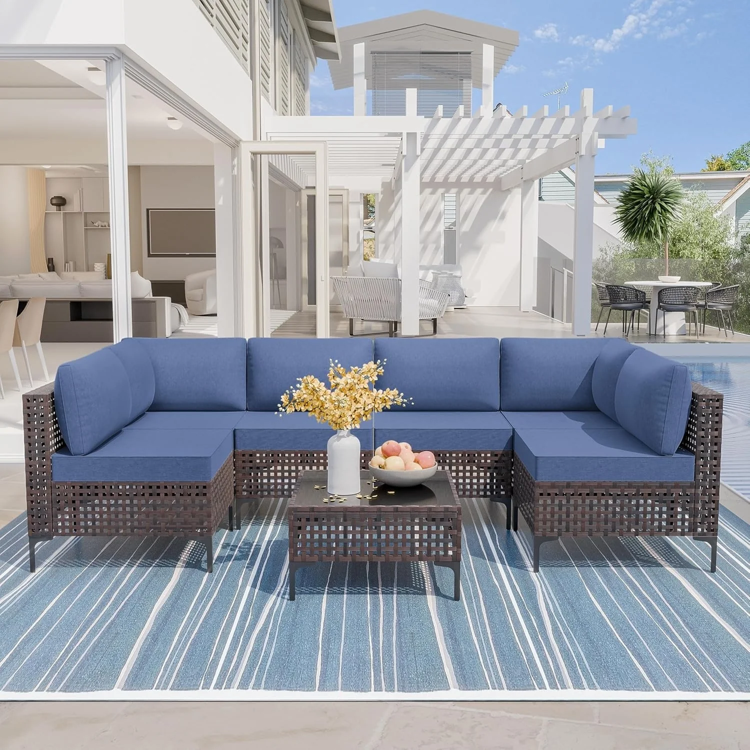 Outdoor 6 Pieces Wicker Sectional Sofa Set with Fire Pit Table