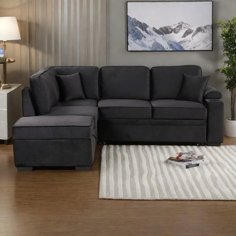 84.75 Velvet Convertible L-Shaped Sleeper Sofa with Storage Ottoman