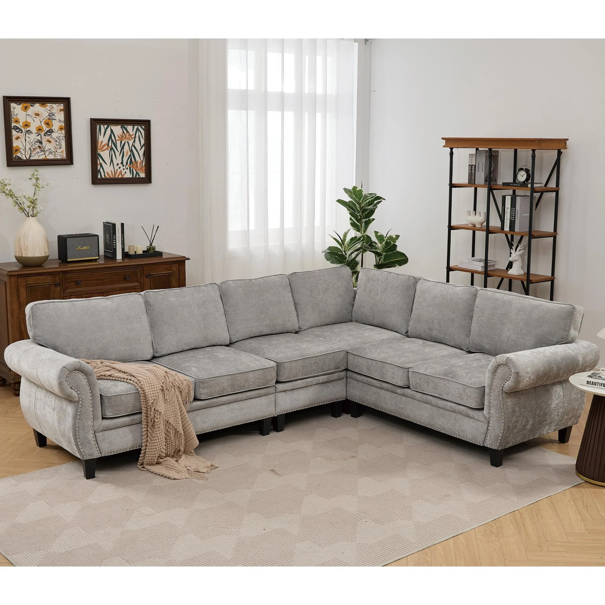 109.5 Chenille 6-Seater L-Shaped Sofa with Rolled Armrests
