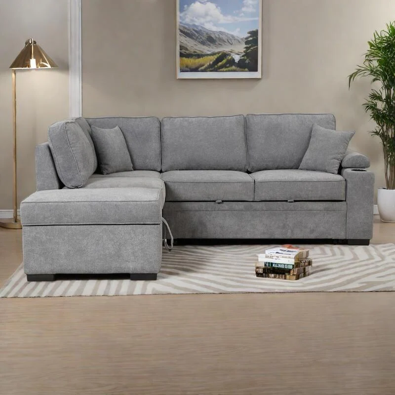 84.75 Linen Convertible L-Shaped Sleeper Sofa with Storage Ottoman