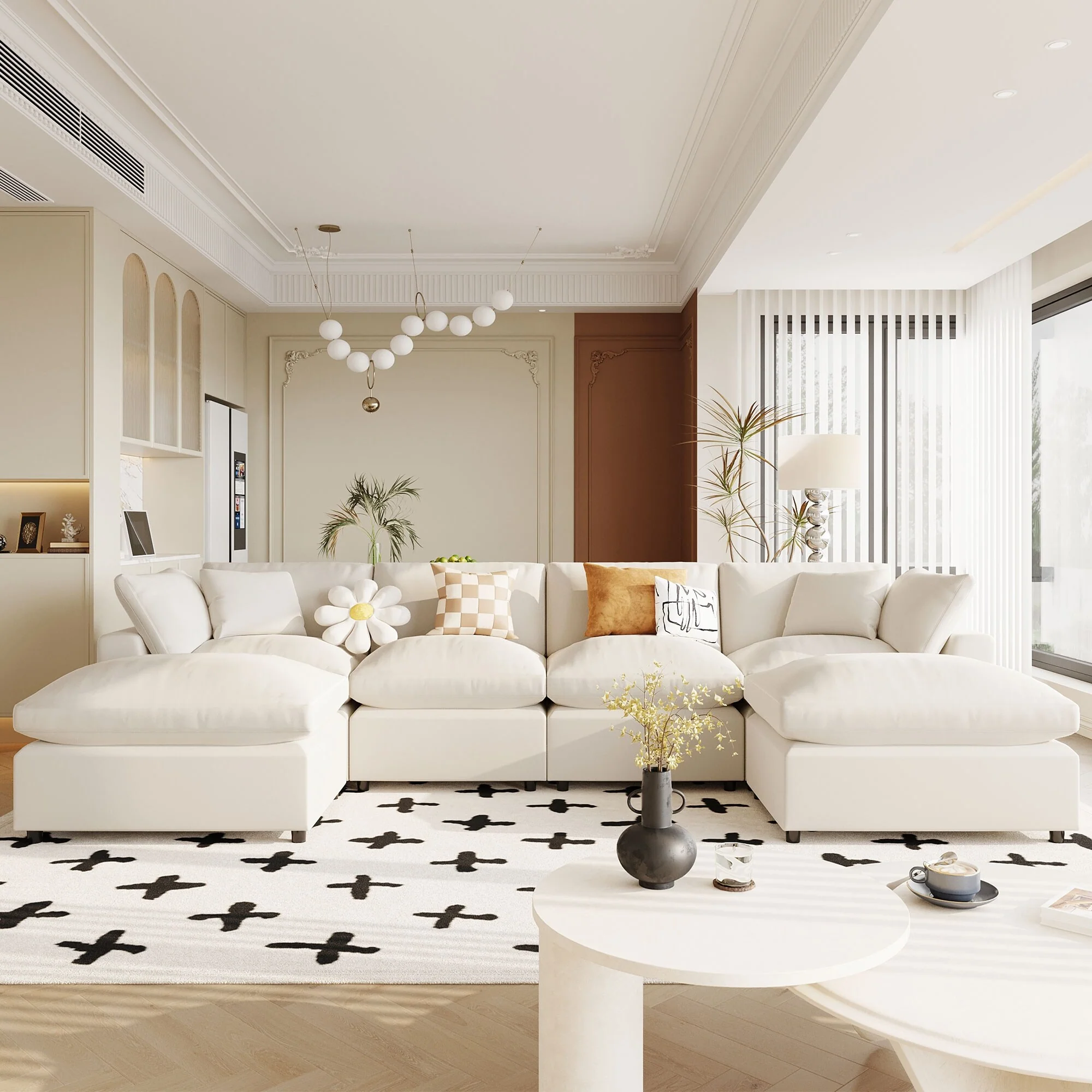 Beige 134.40 Modern U-Shaped 6-Seater Sofa with Large Chaises