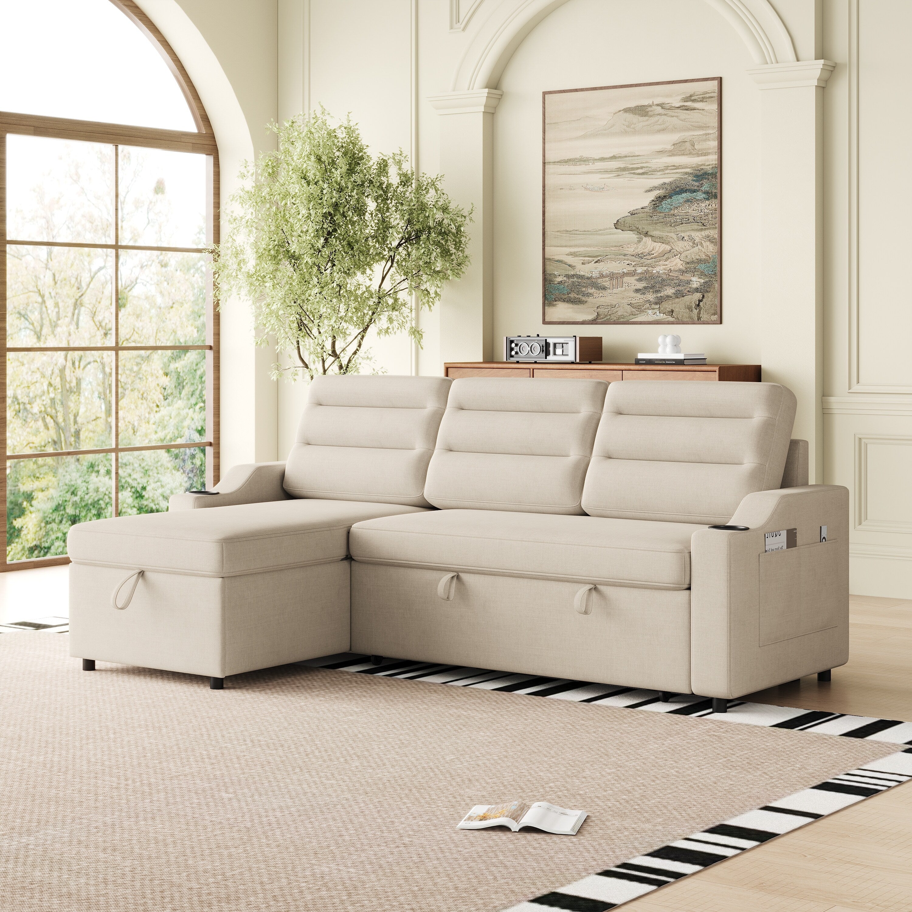 132.3 Linen Blend U-Shaped Sectional Sofa with Ottomans & Storage