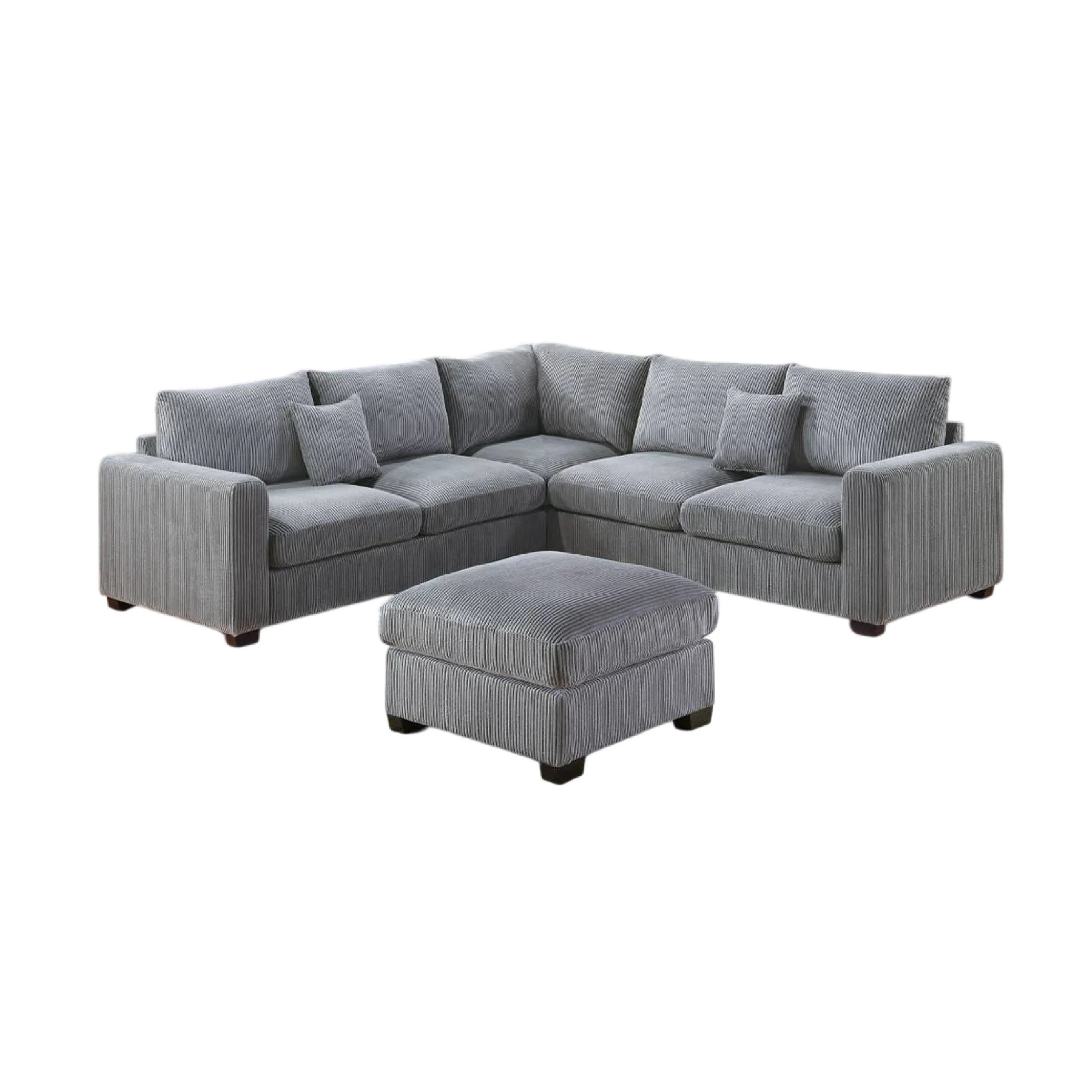 Rey 4pc L Sectional Sofa Set, 2 Accent Pillows, Gray Corduroy Fabric