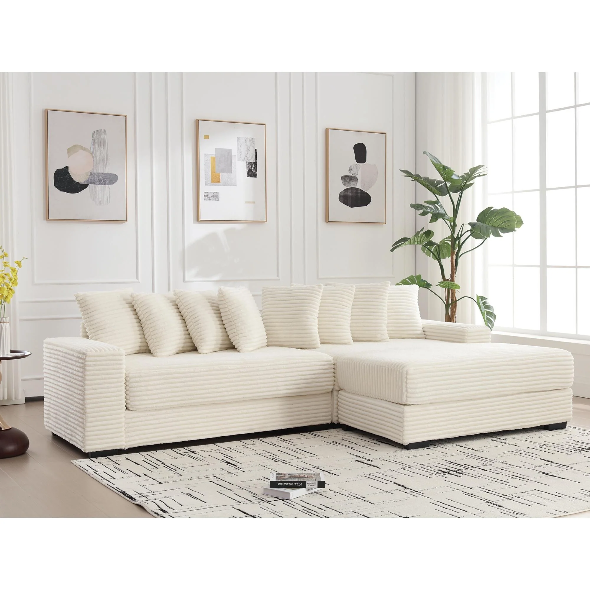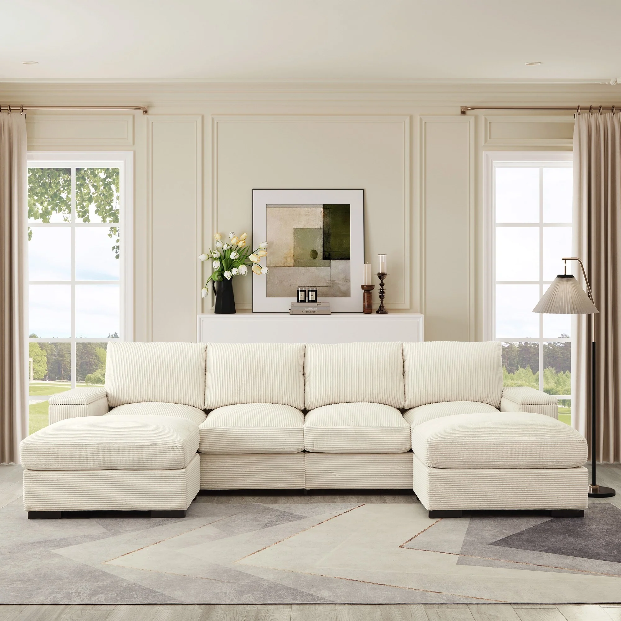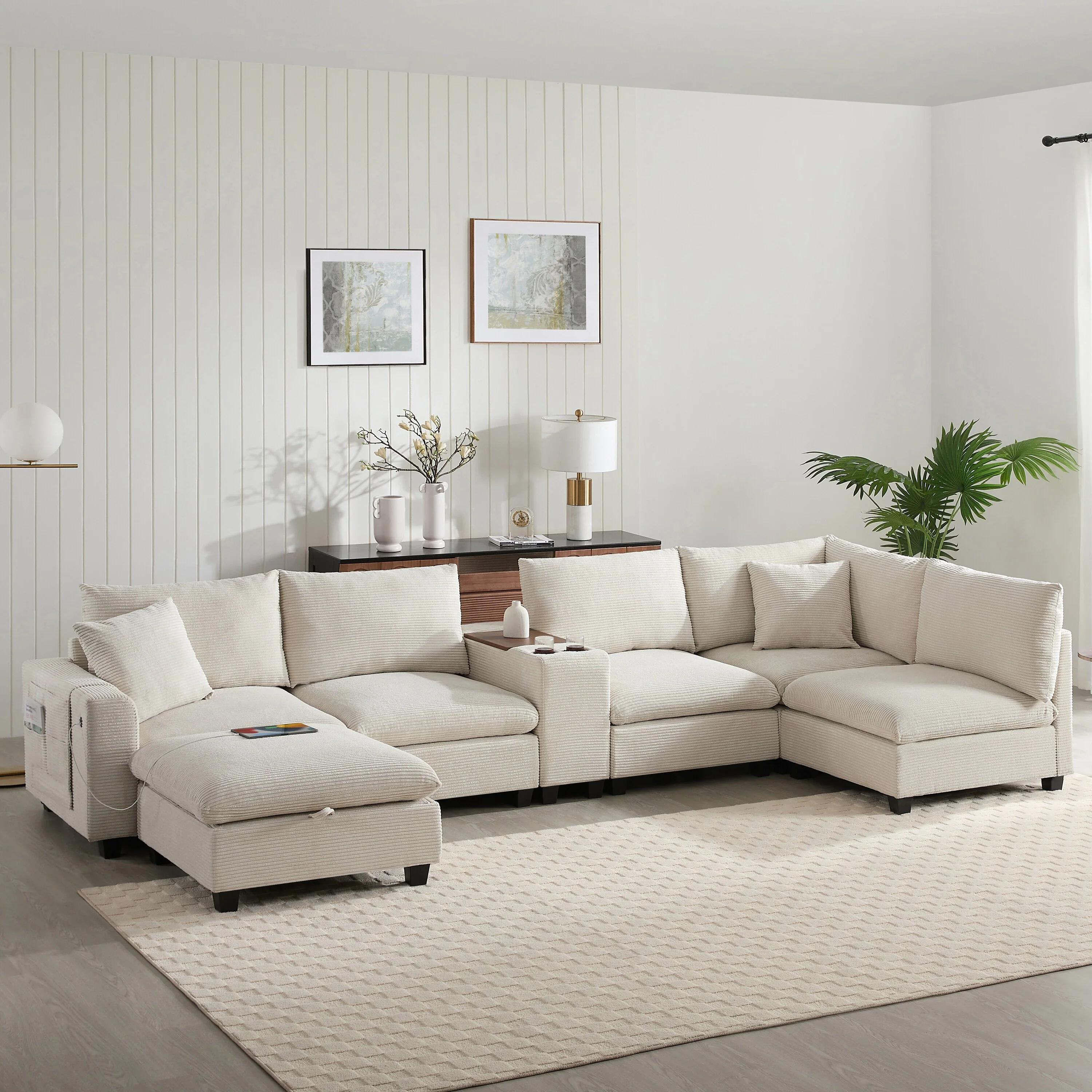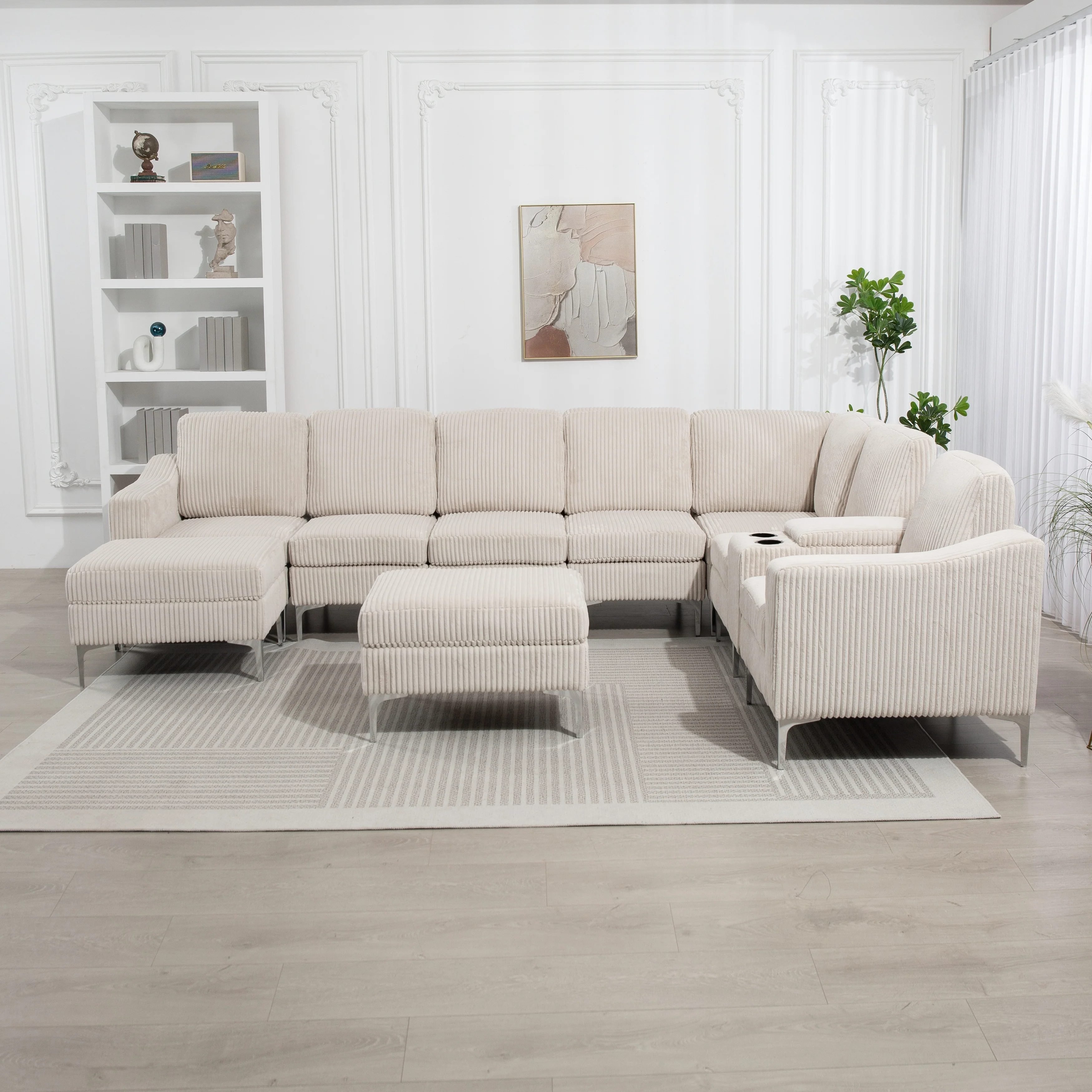 U-shaped corduroy sofa with removable footstool and storage armrests