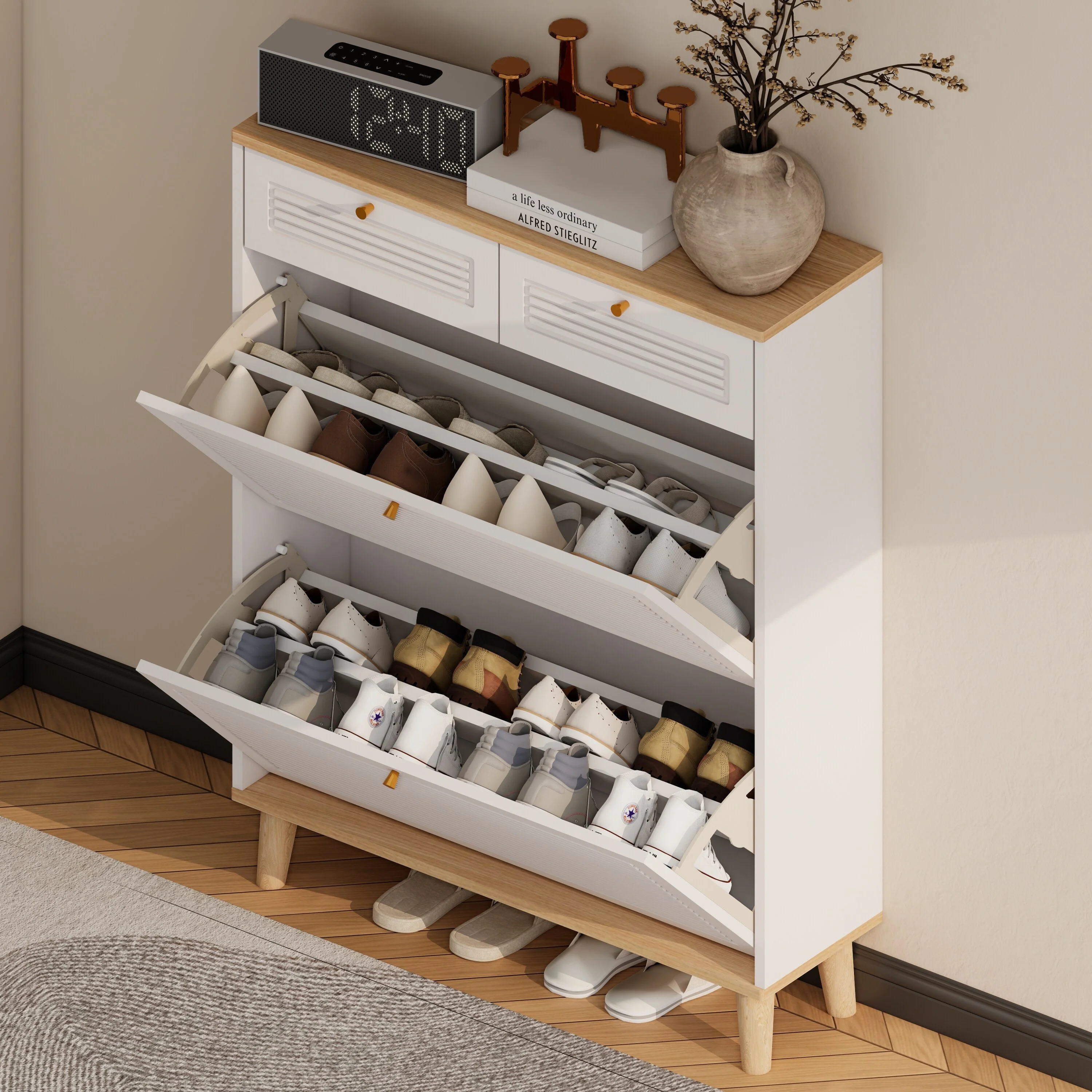 16-Pair Entryway Shoe Cabinet, 2 Flip Doors and Drawers in White