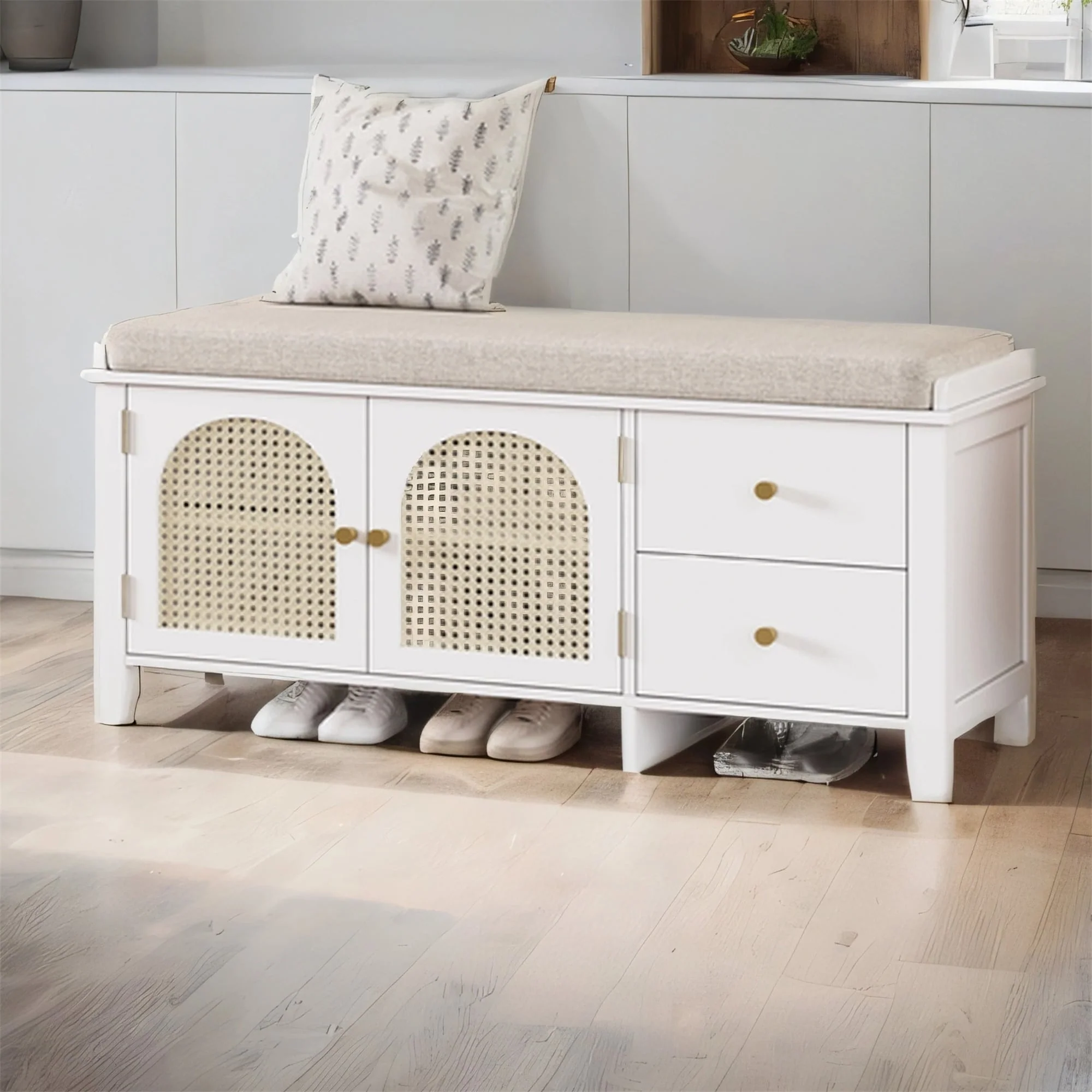 Wood Shoe Storage Bench with Cushion,2 Drawers and 2 Rattan Door