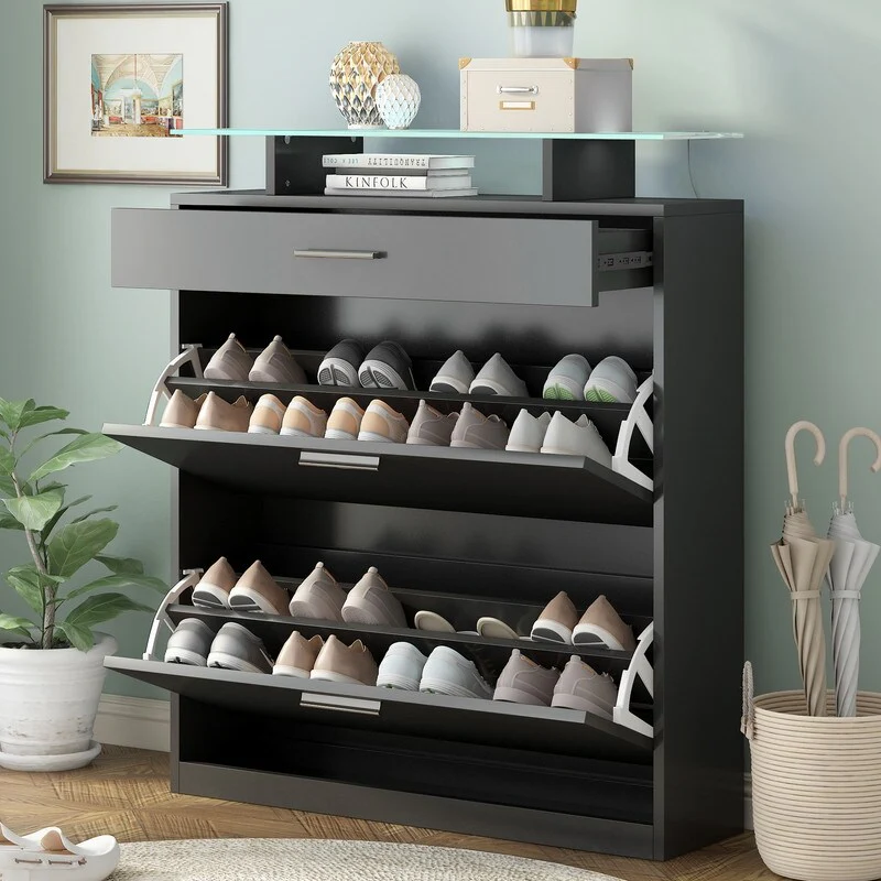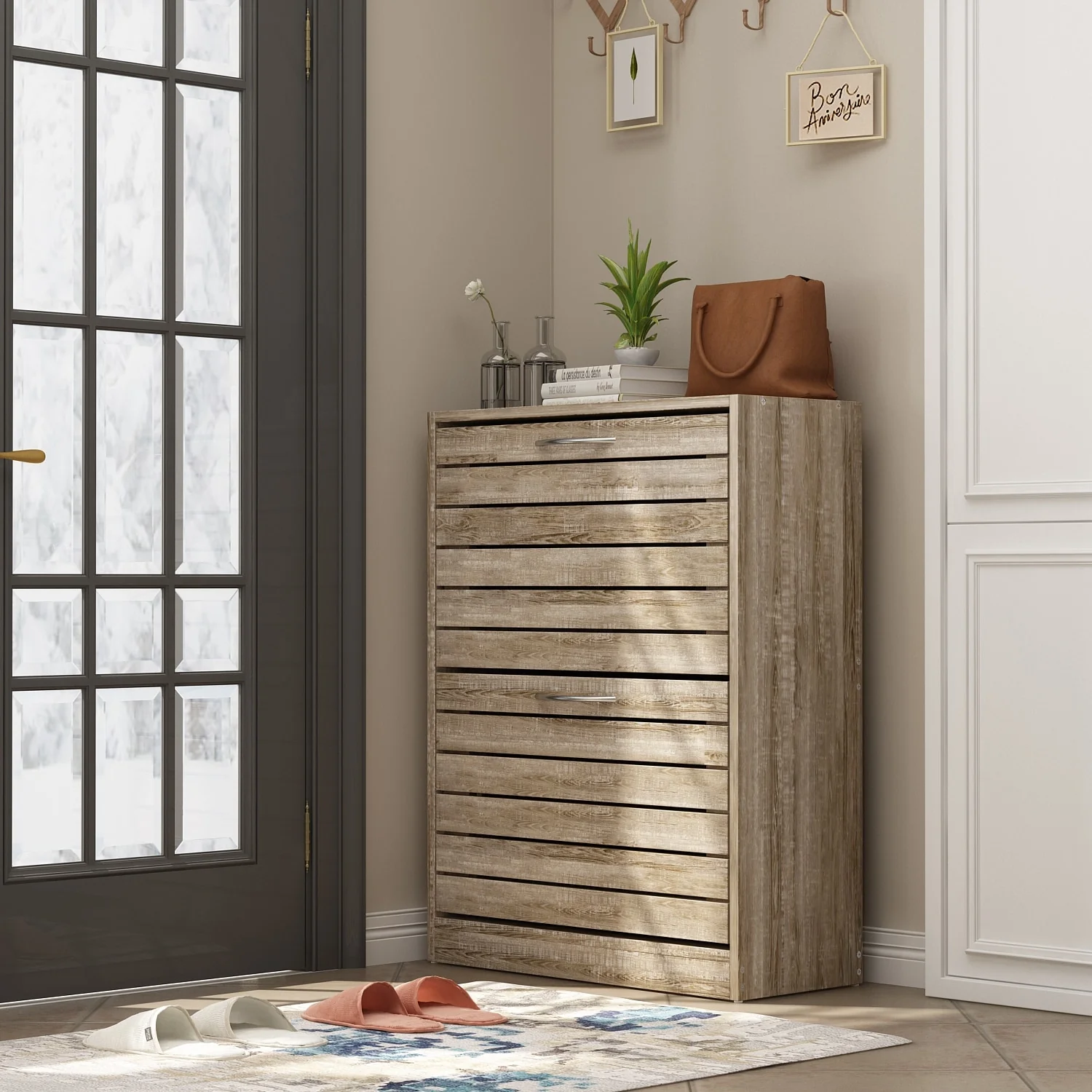 Hidden Narrow Wood Shoe Rack Cabinet with 2 Drawers for Entryway