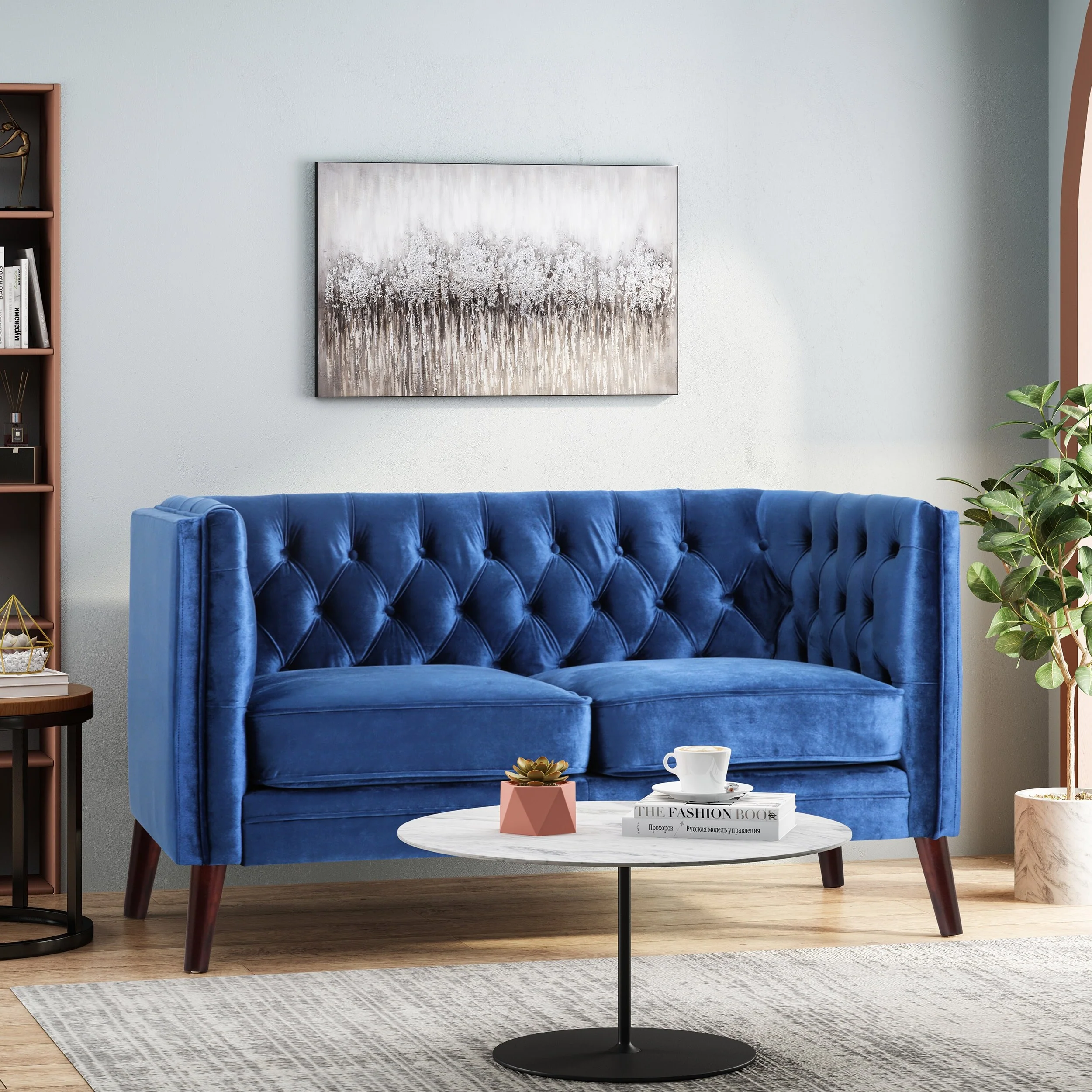 Navy Blue Loveseat Button Tufted Sofa with Wood Legs