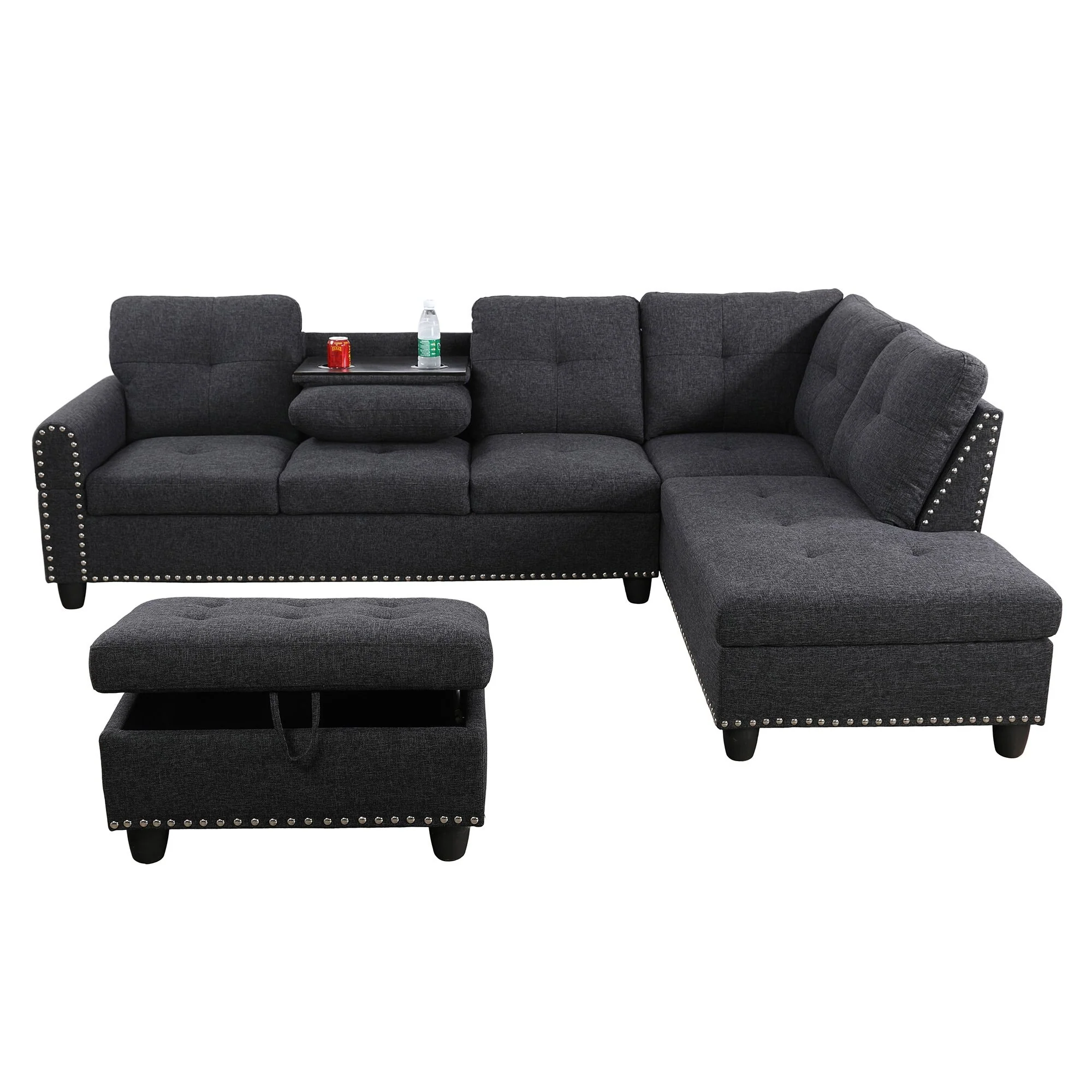 86.6'' Linen Chesterfield Sofa with Chaise and Nailhead Trim
