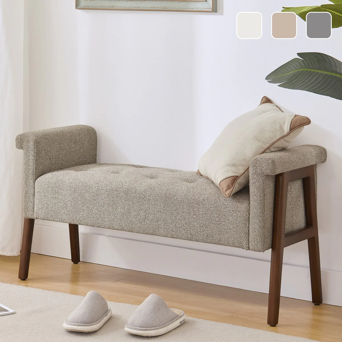 Rosana Accent Bench, Beige Fabric, 2 Round Bolster Pillows, 64 Inch