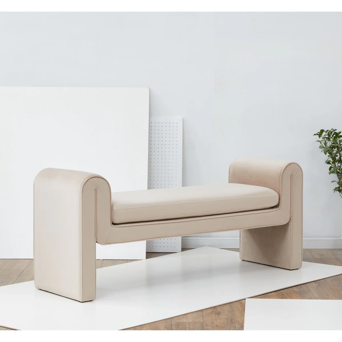 Beige Fabric and White Finish Bench W/Storage