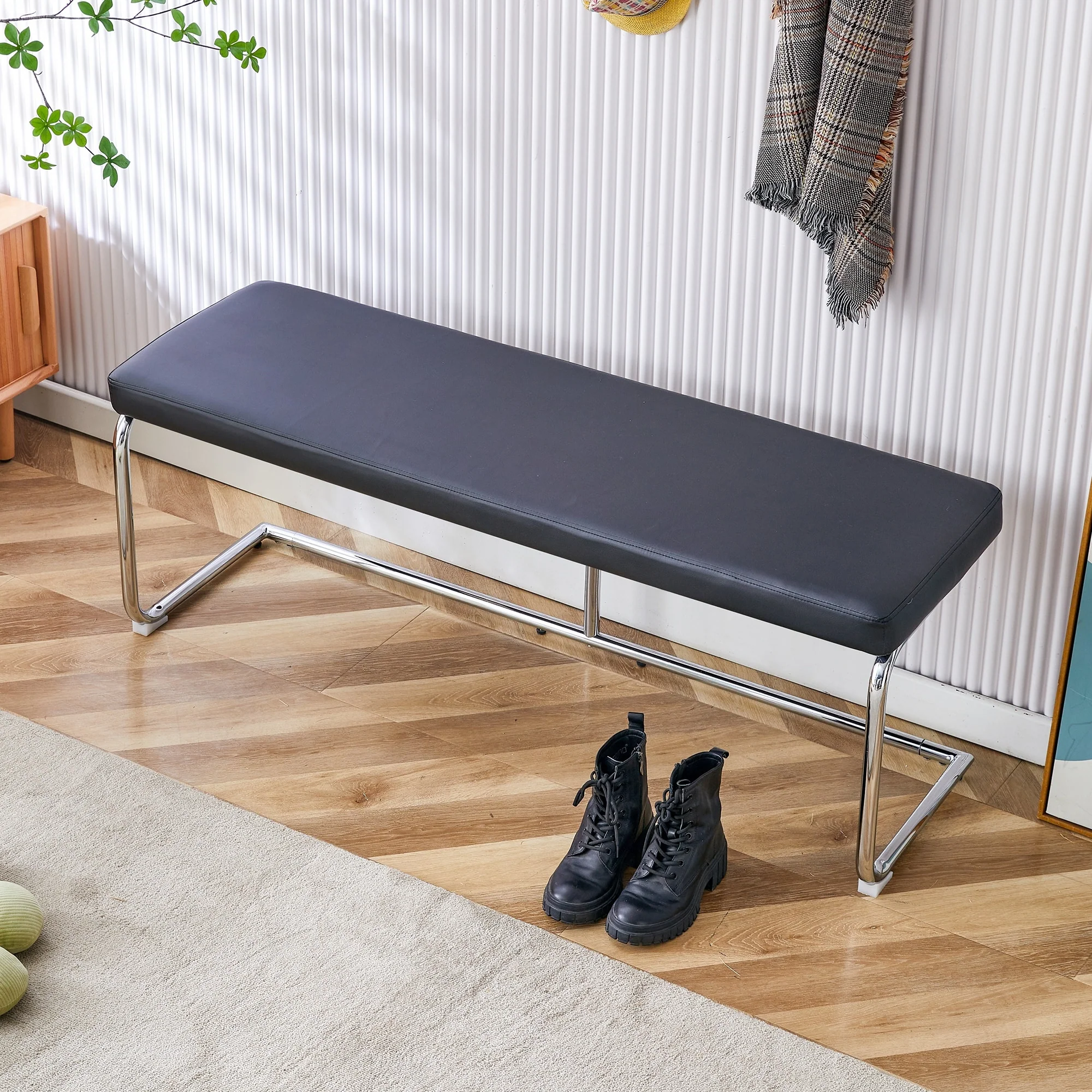Black shoe changing bench silver metal legs