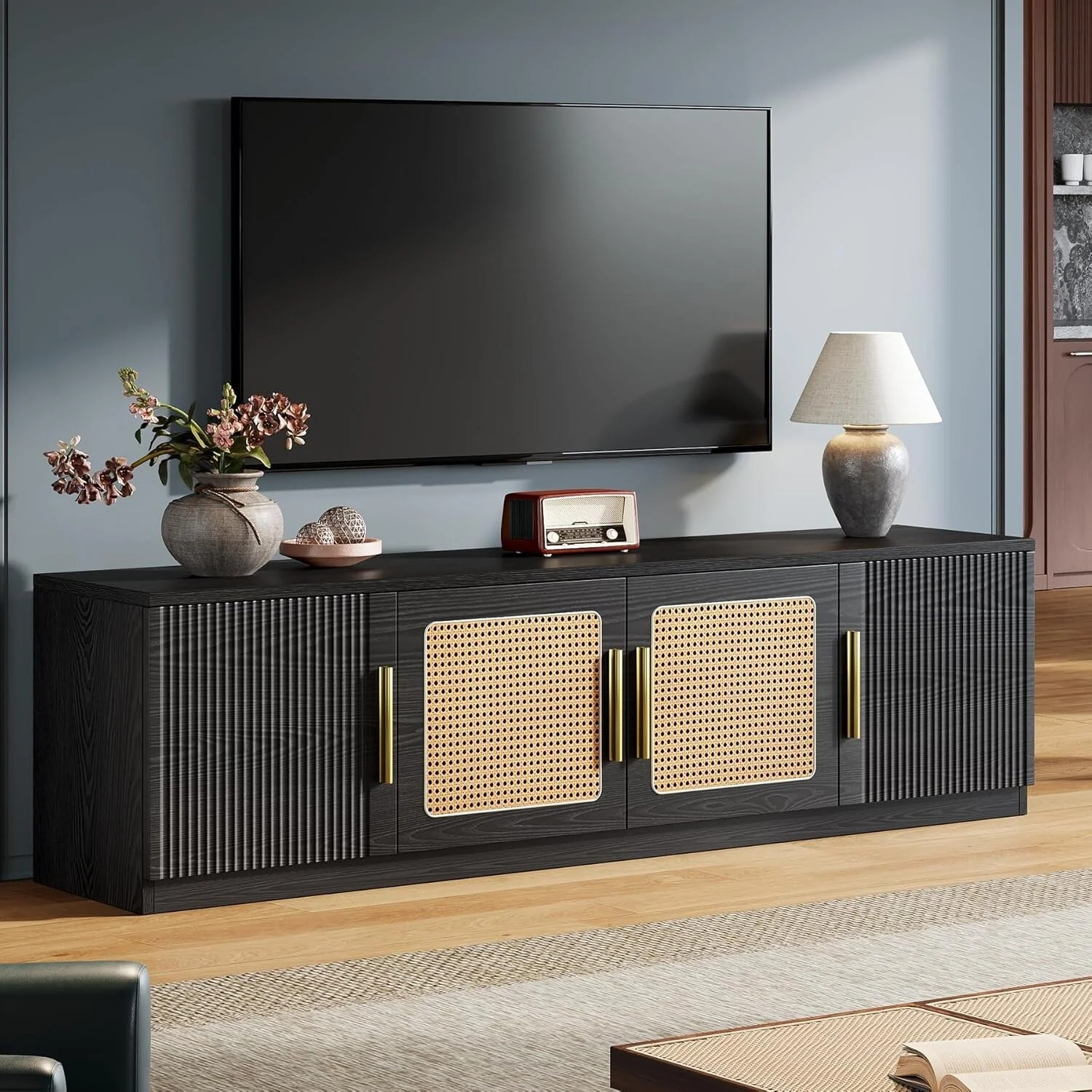 Rattan TV Stand with 2 Cabinets and 2 Open Shelves