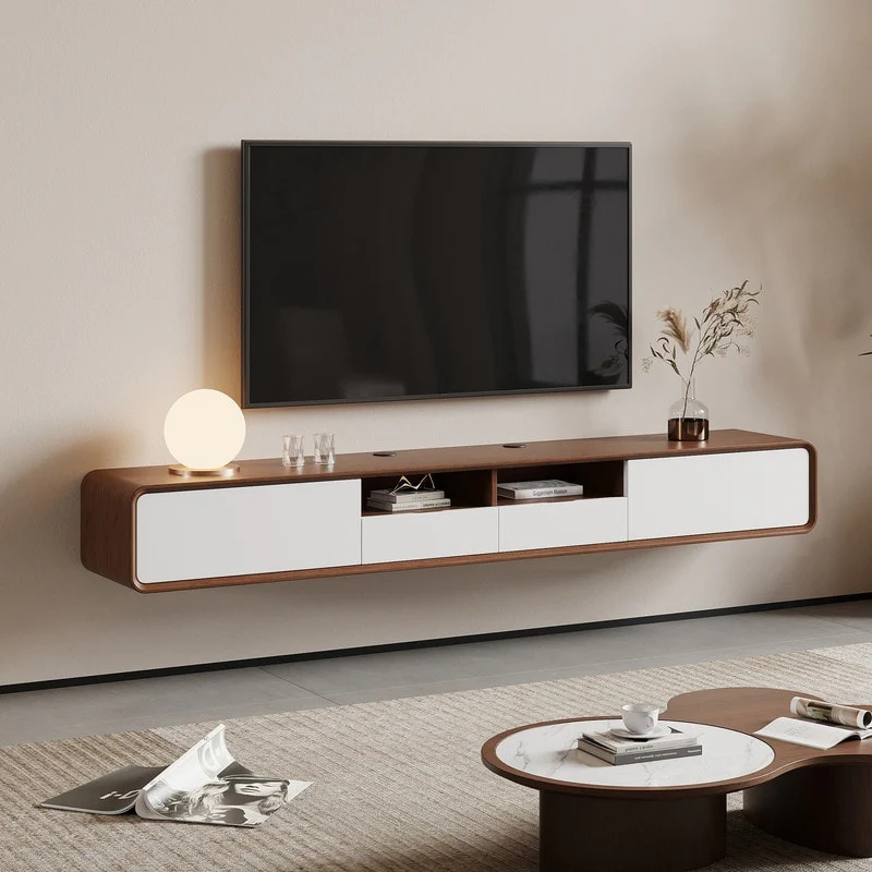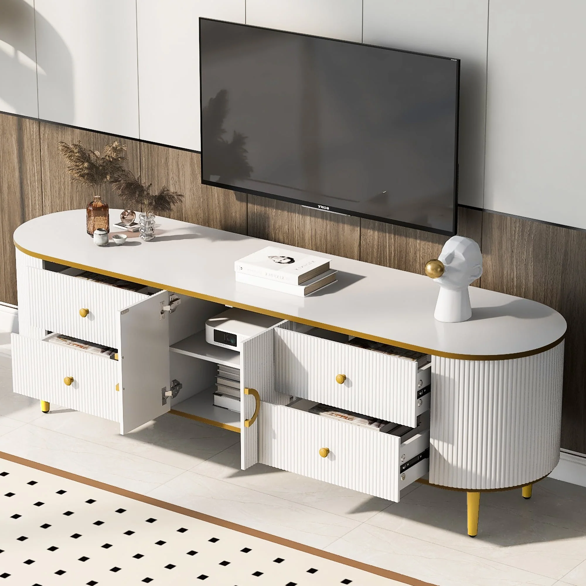 Curved TV Stand with 4 Drawers, Cabinet, and Metal Legs
