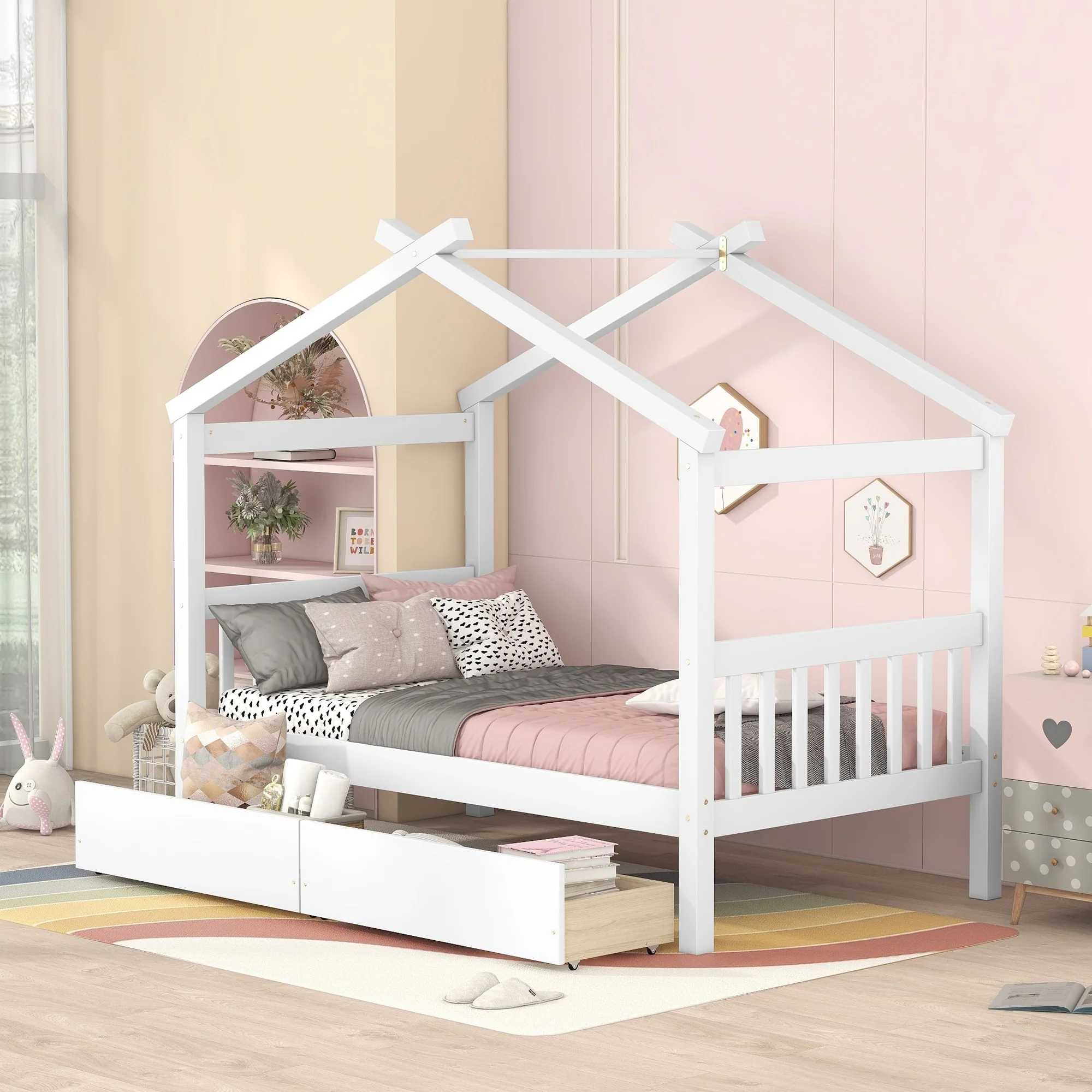 Twin Size House Bed with Roof, Wood Frame, and Play Space