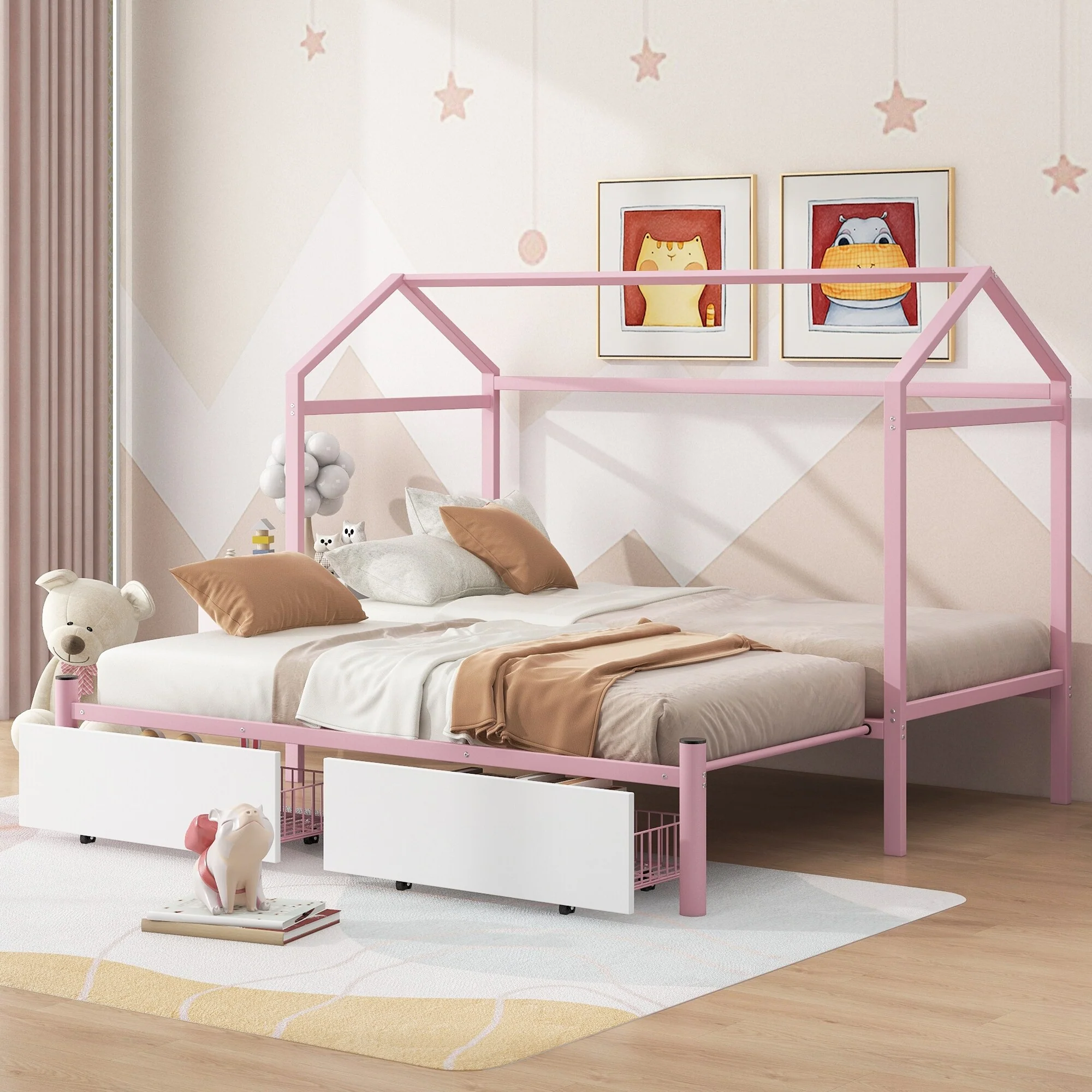 Twin Size Metal House Bed for Kids, Floor Bed Frame with Slats