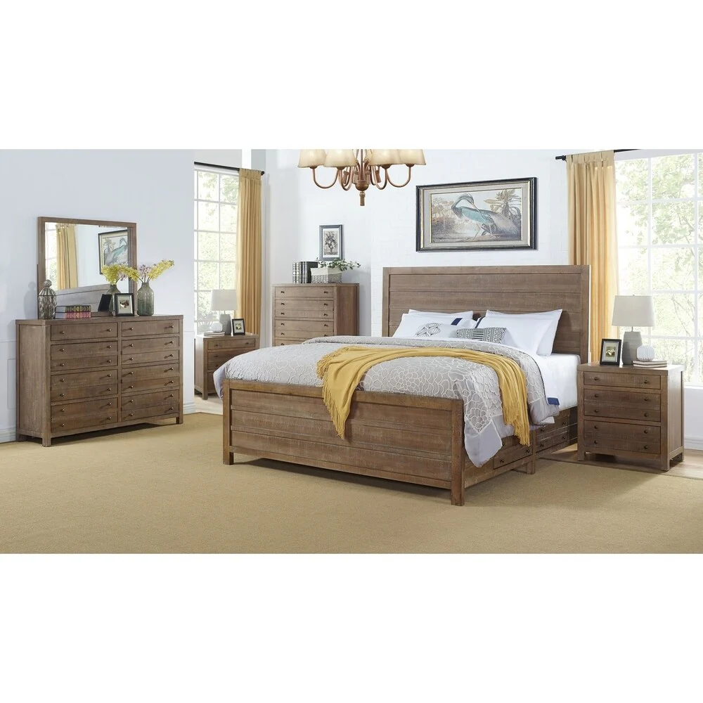 HomeRoots Four Piece Wood Brown Solid Wood Bedroom Set With Mirror