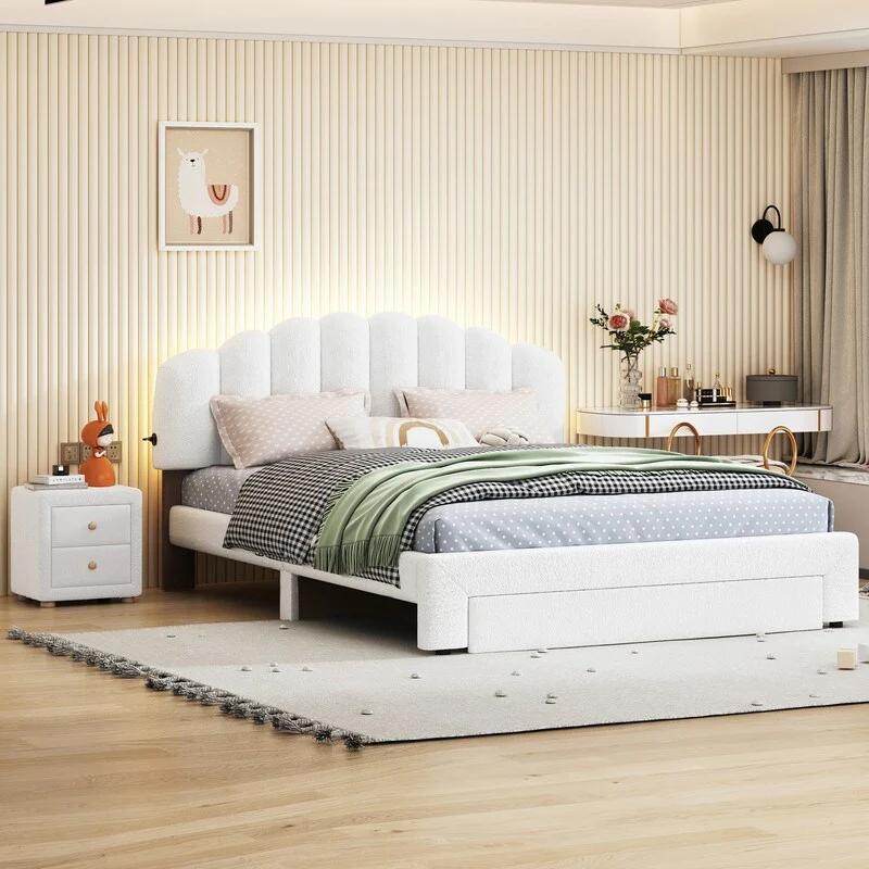 Teddy Fleece Queen Size Upholstered Platform Bed with Nightstand