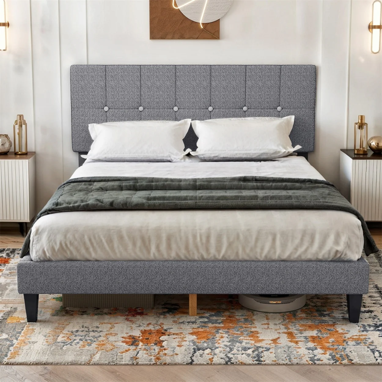 Grey Upholstered Queen Size Platform Bed