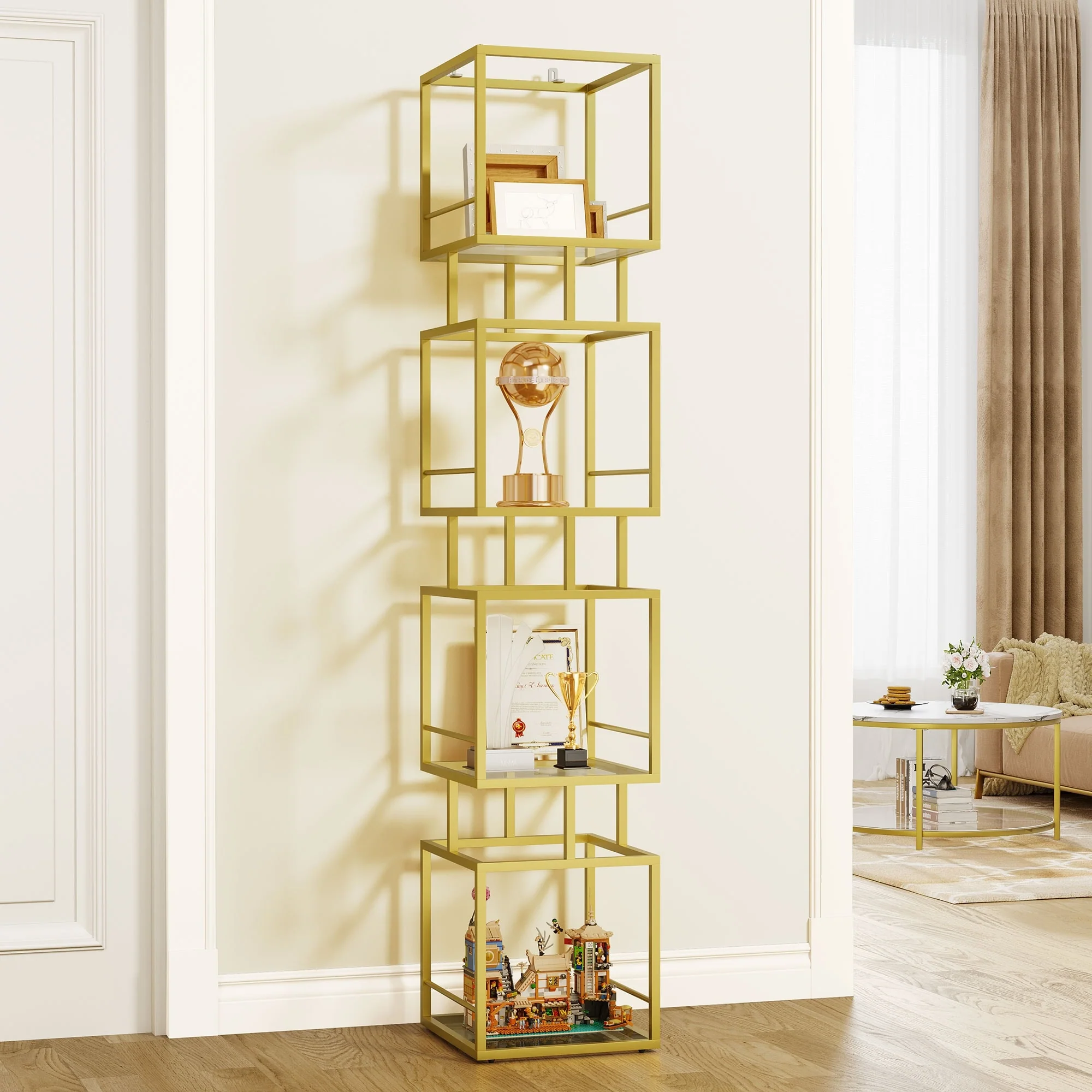 Moasis 4-Tier Bookshelf Glass Shelving with Gold Metal Frame