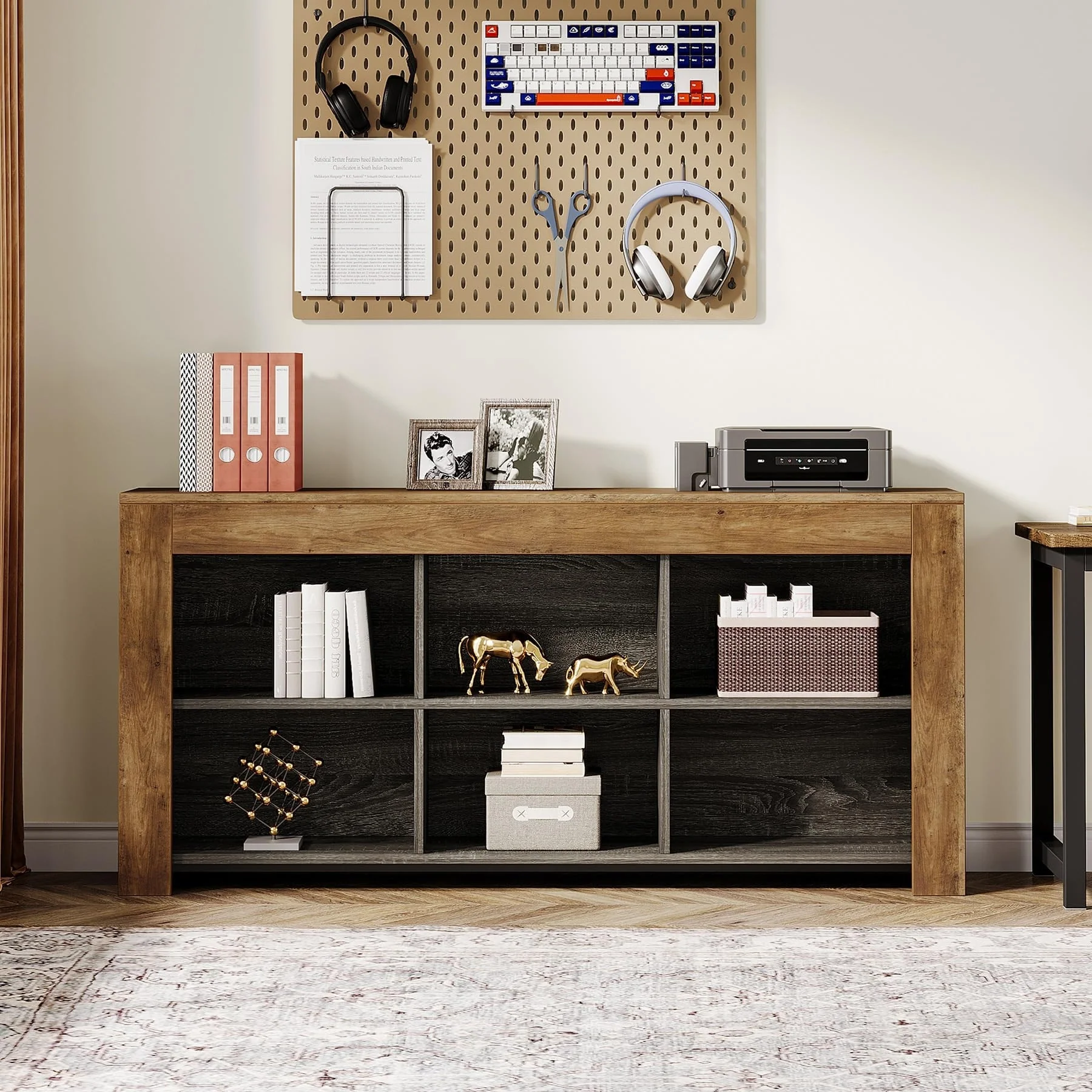 Horizontal Bookcase with 6 Cubes , Rustic Wood Bookshelf