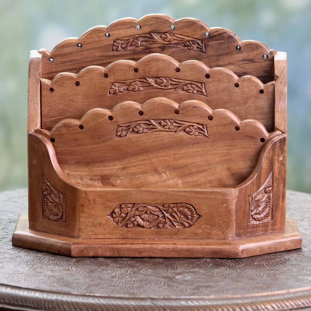 Handmade Walnut Wood 'Floral Blossom' Letter Rack (India)