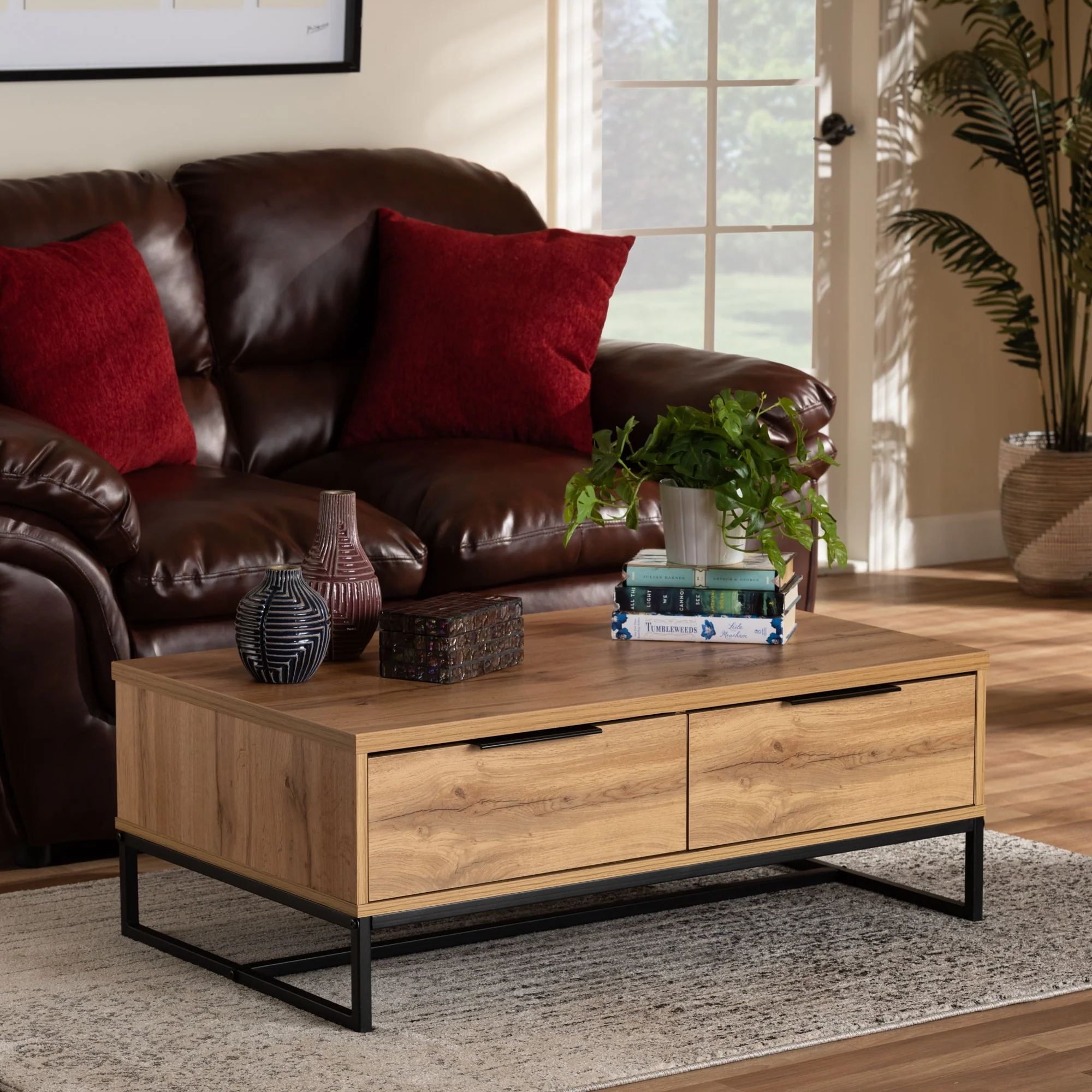 Franklin Oak Brown Wood and Black Metal 2-Drawer Coffee Table
