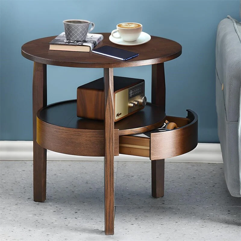 Round Oak Wood Coffee Table with Hidden Drawer - 20D x 16W x 20H
