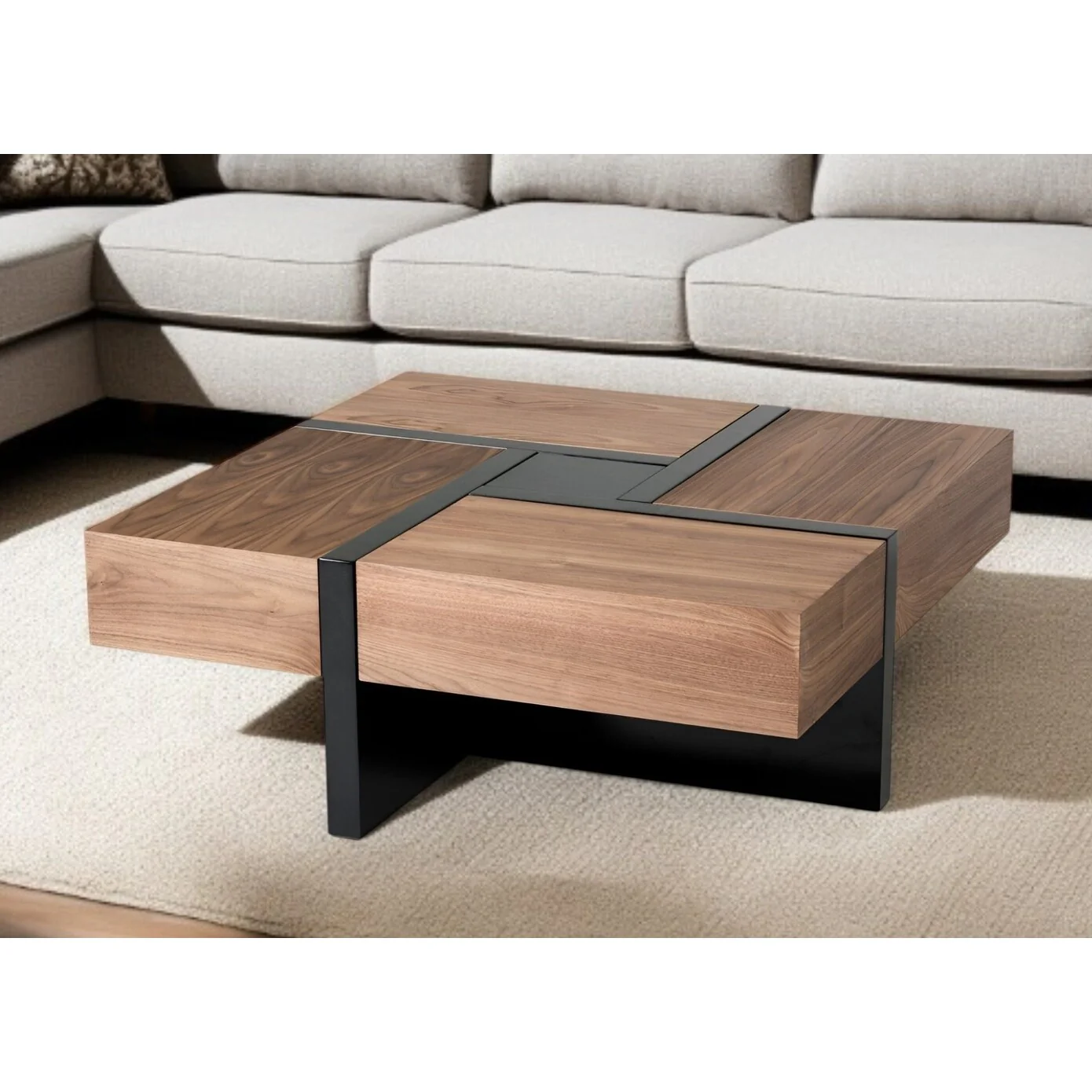 Modern Walnut and Black Square Coffee Table with Storage