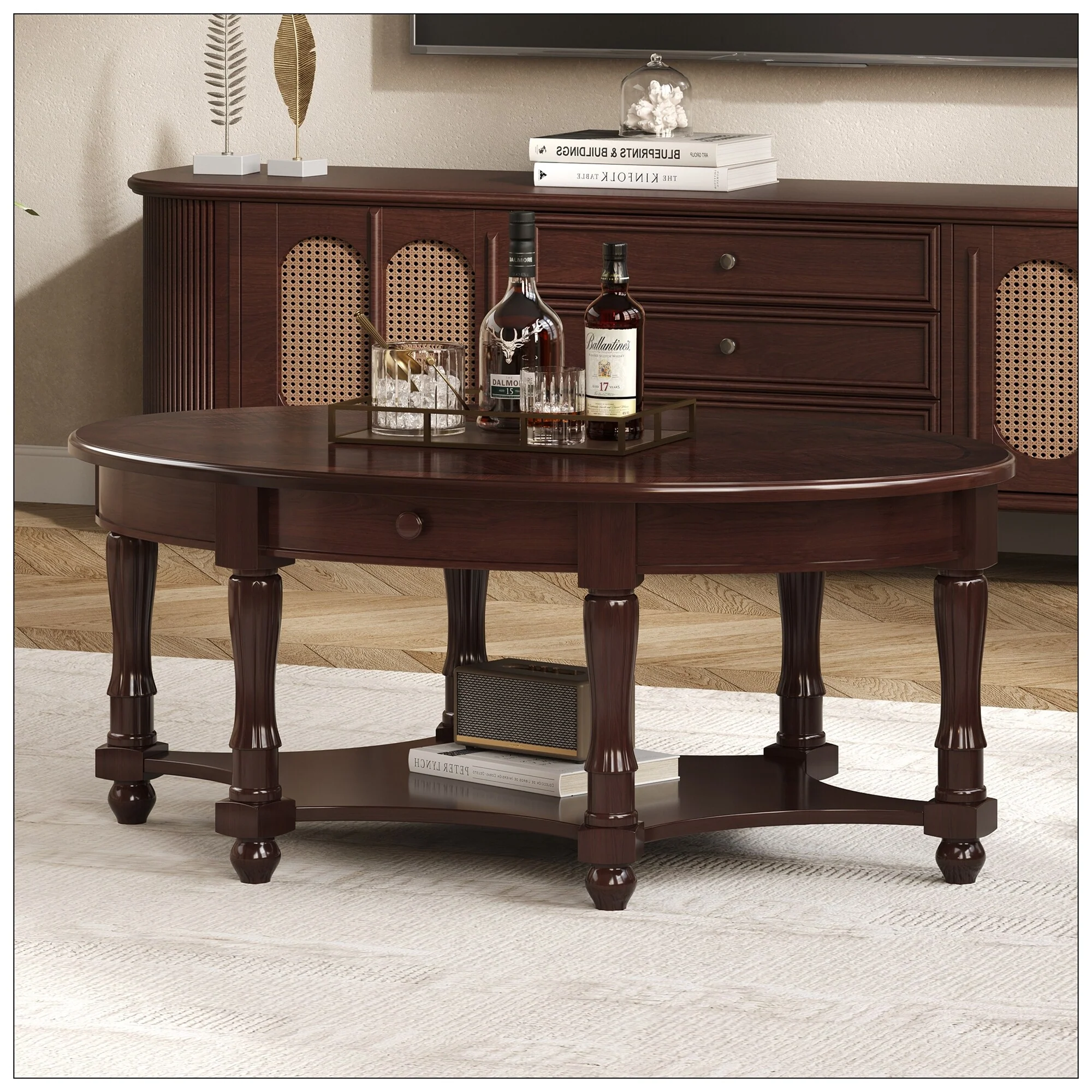 Vintage Oval Coffee Table with Drawer and Storage Shelf