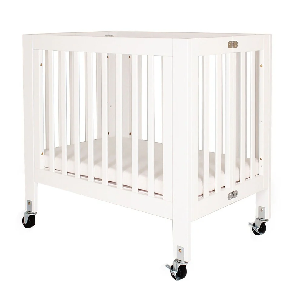 Foldable Wood and Metal Crib with Casters and Slatted Details, White