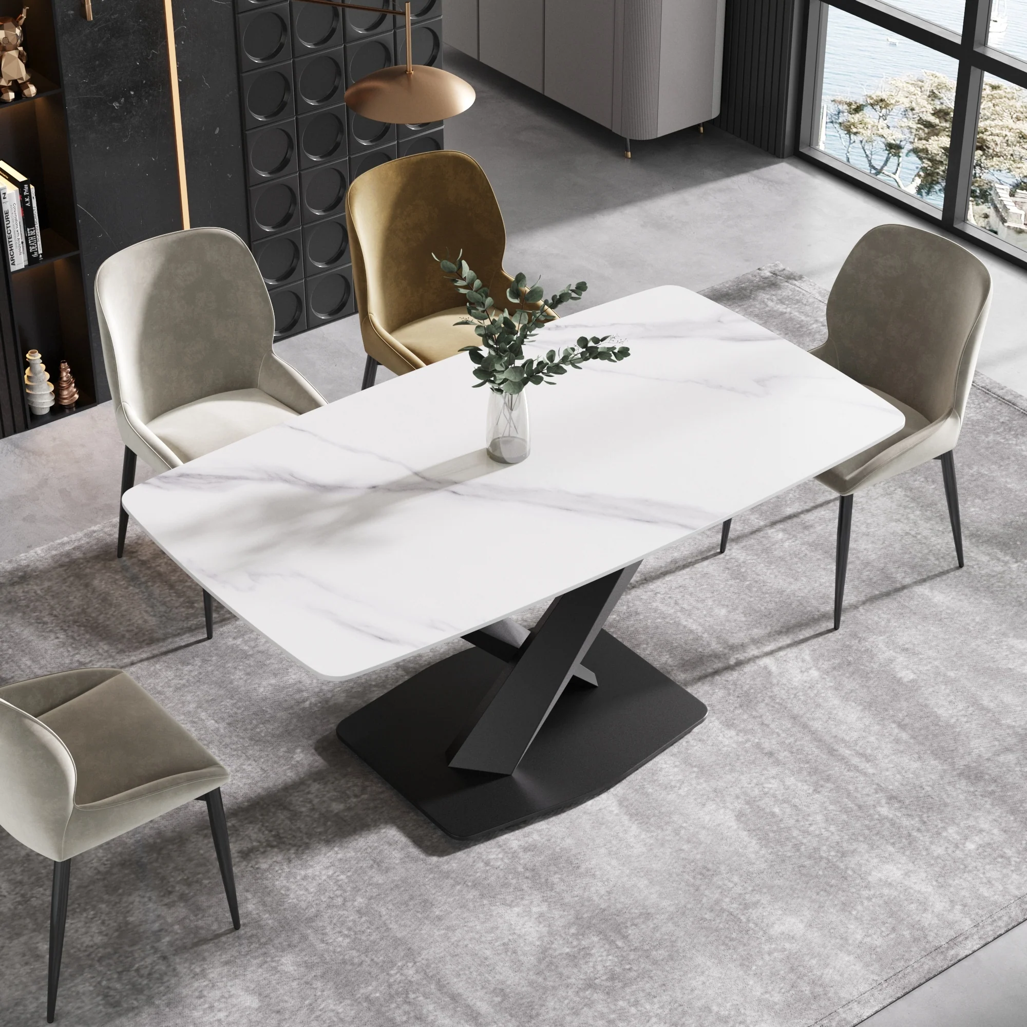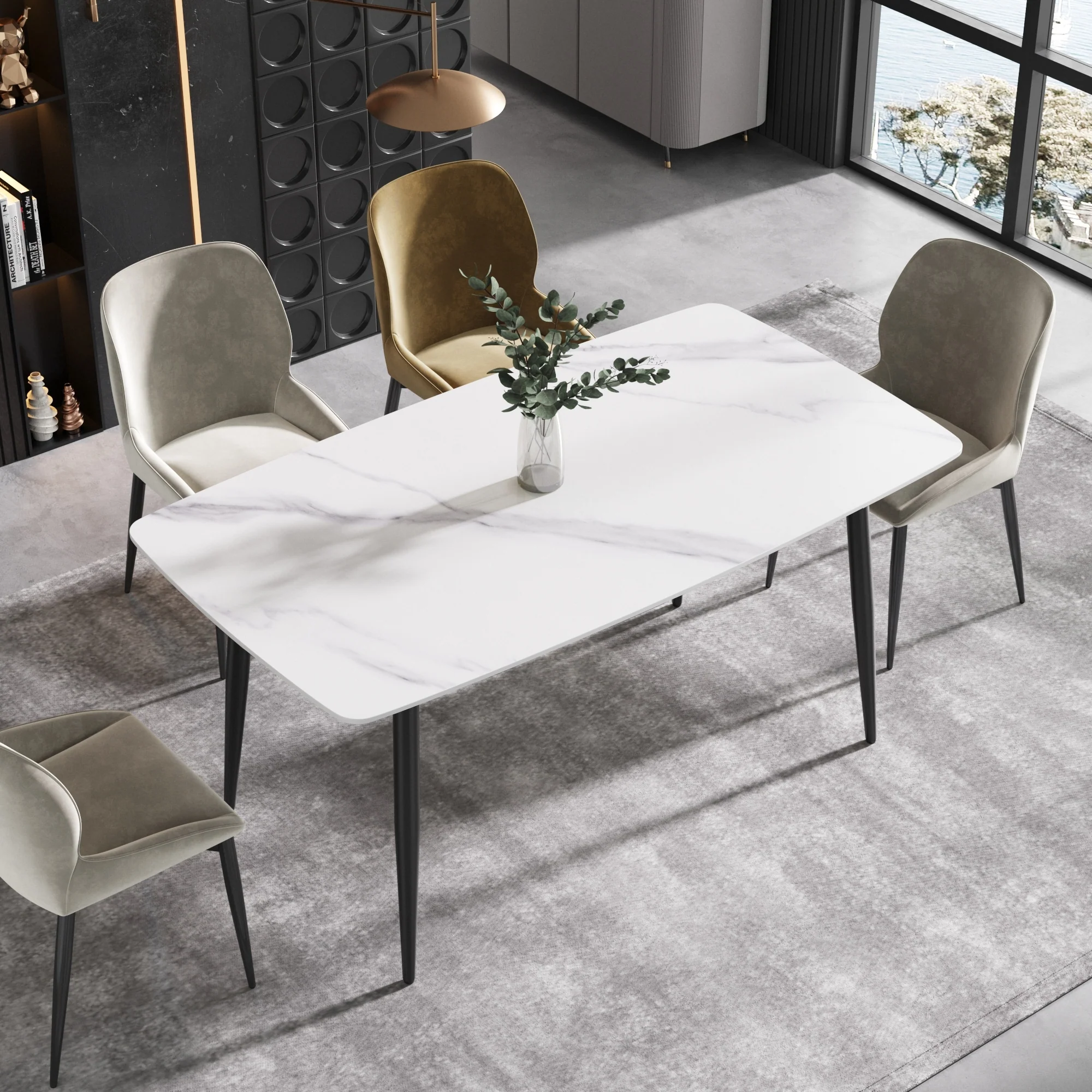63 Modern Sintered Stone Dining Table,Solid Black Carbon Steel Base