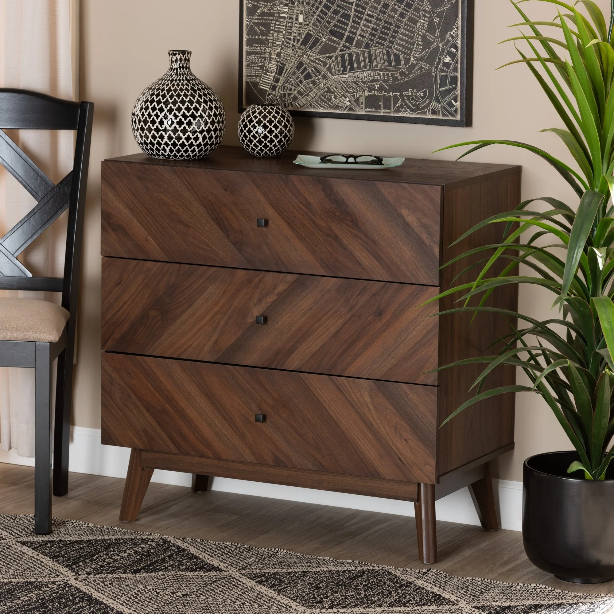 Black and Brown Wood 3-Drawer Rattan Chest
