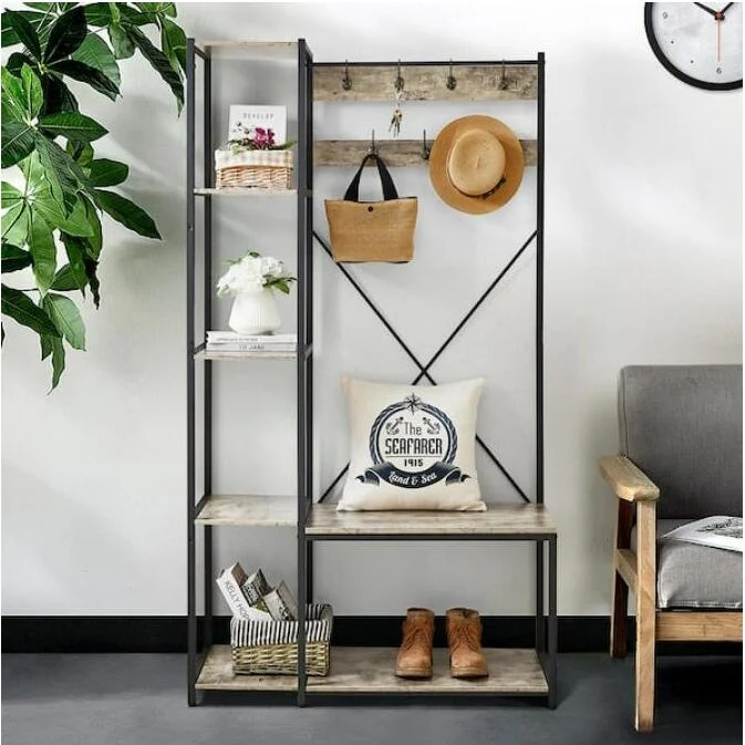 Entryway Hall Tree with 4 Hooks, Storage Bench and Open shelves