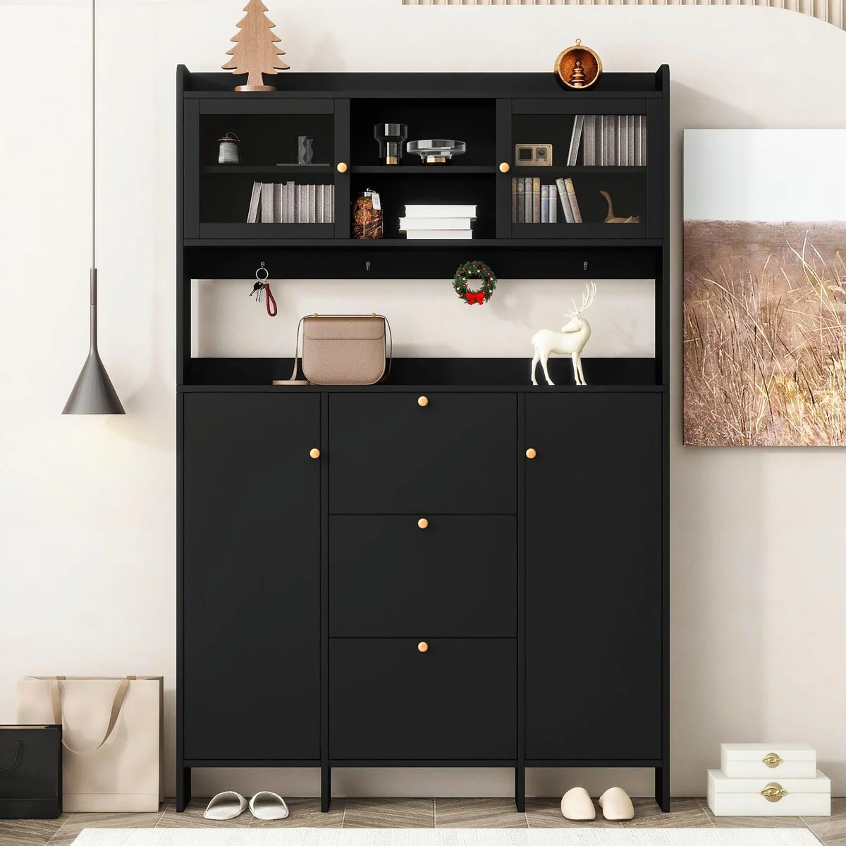 Functional Hall Tree with 3 Flip Drawers & Tempered Glass Doors