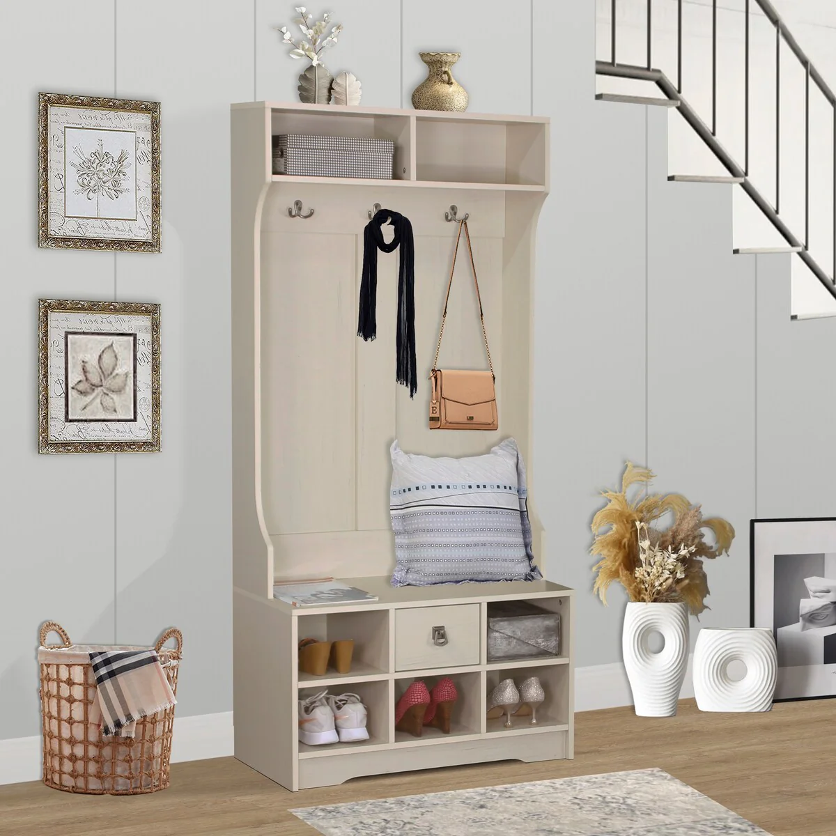 4-in-1 Entryway Bench with Coat Rack and 4-Sturdy Hooks, White