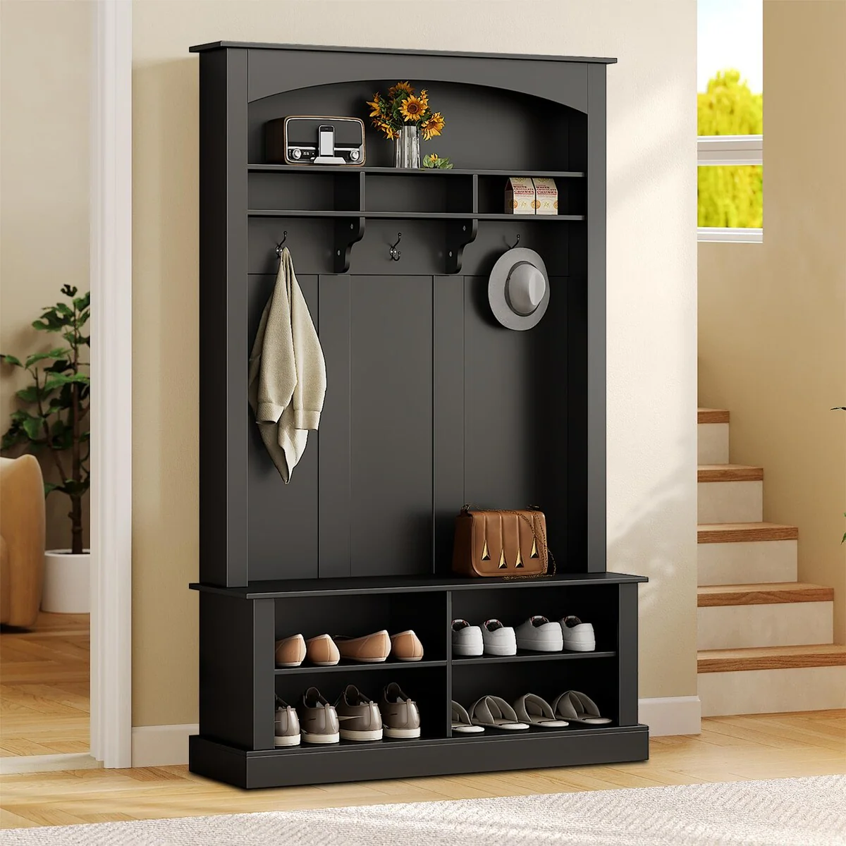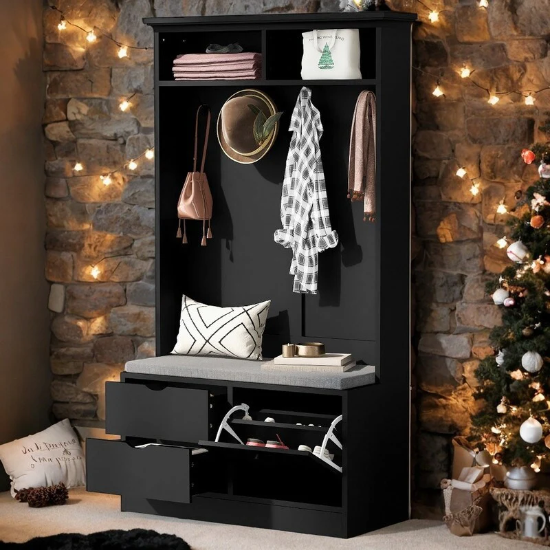 5-in-1 Entryway Bench with Coat Rack and 4-Sturdy Hooks, Black