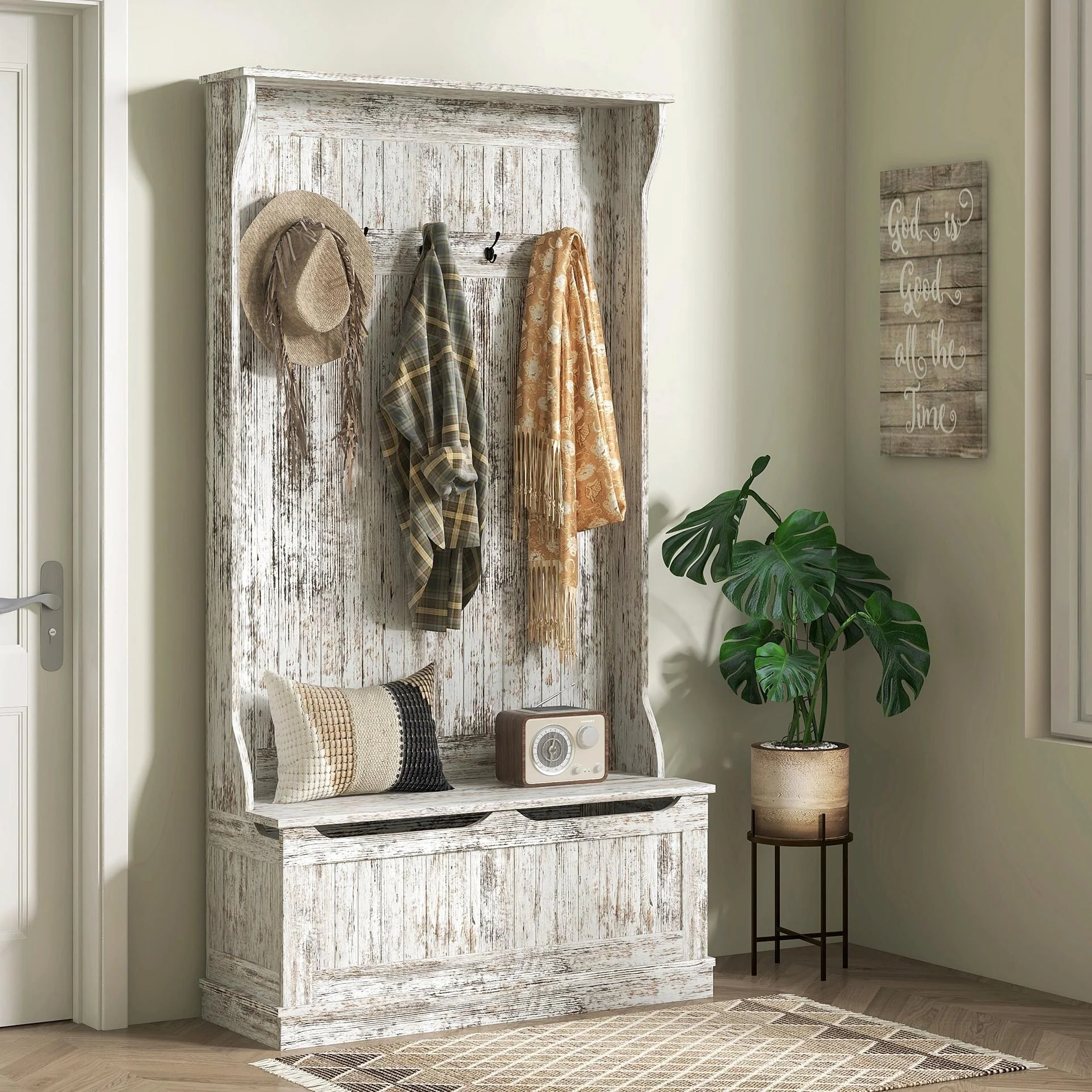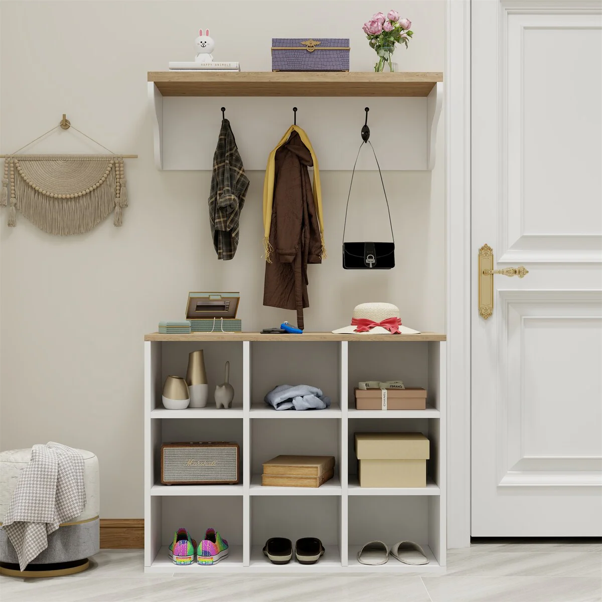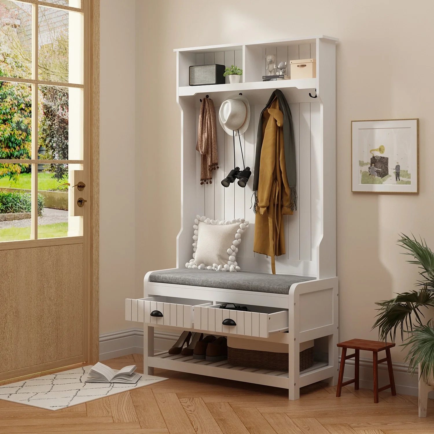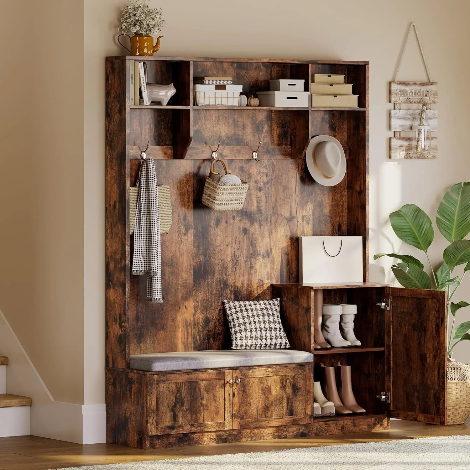 Entryway Bench with Coat Rack & Shoe Storage