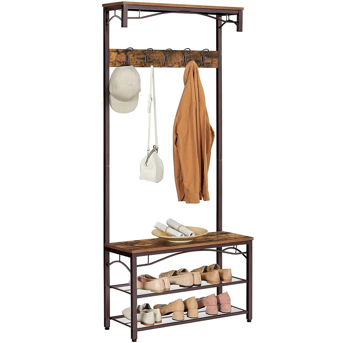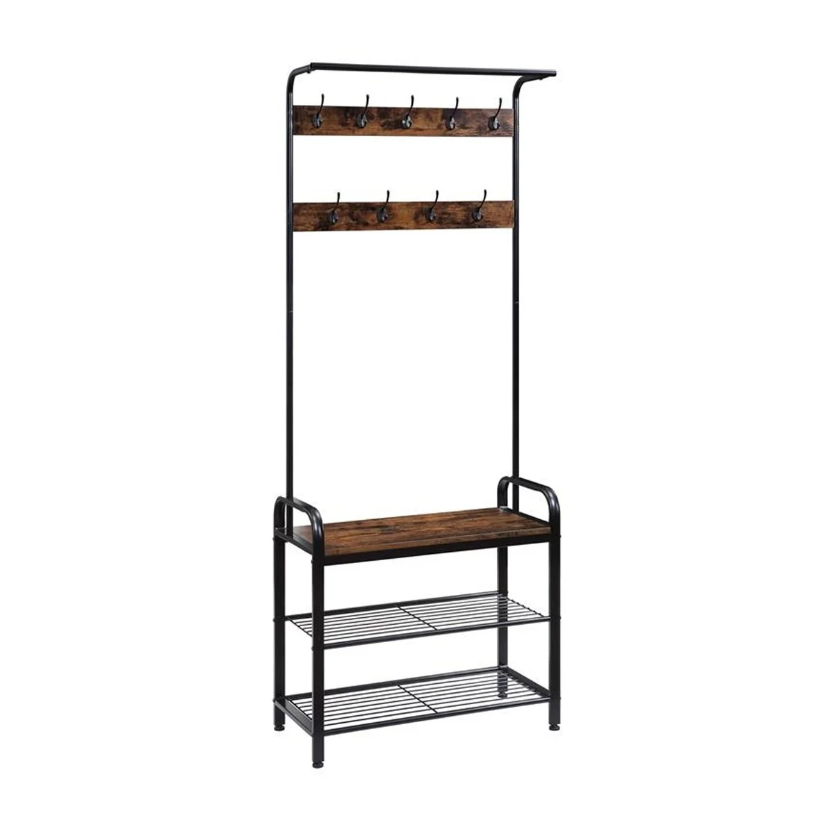 Hall Tree with 9 Hooks and 2 Metal Shelves, Brown and Black