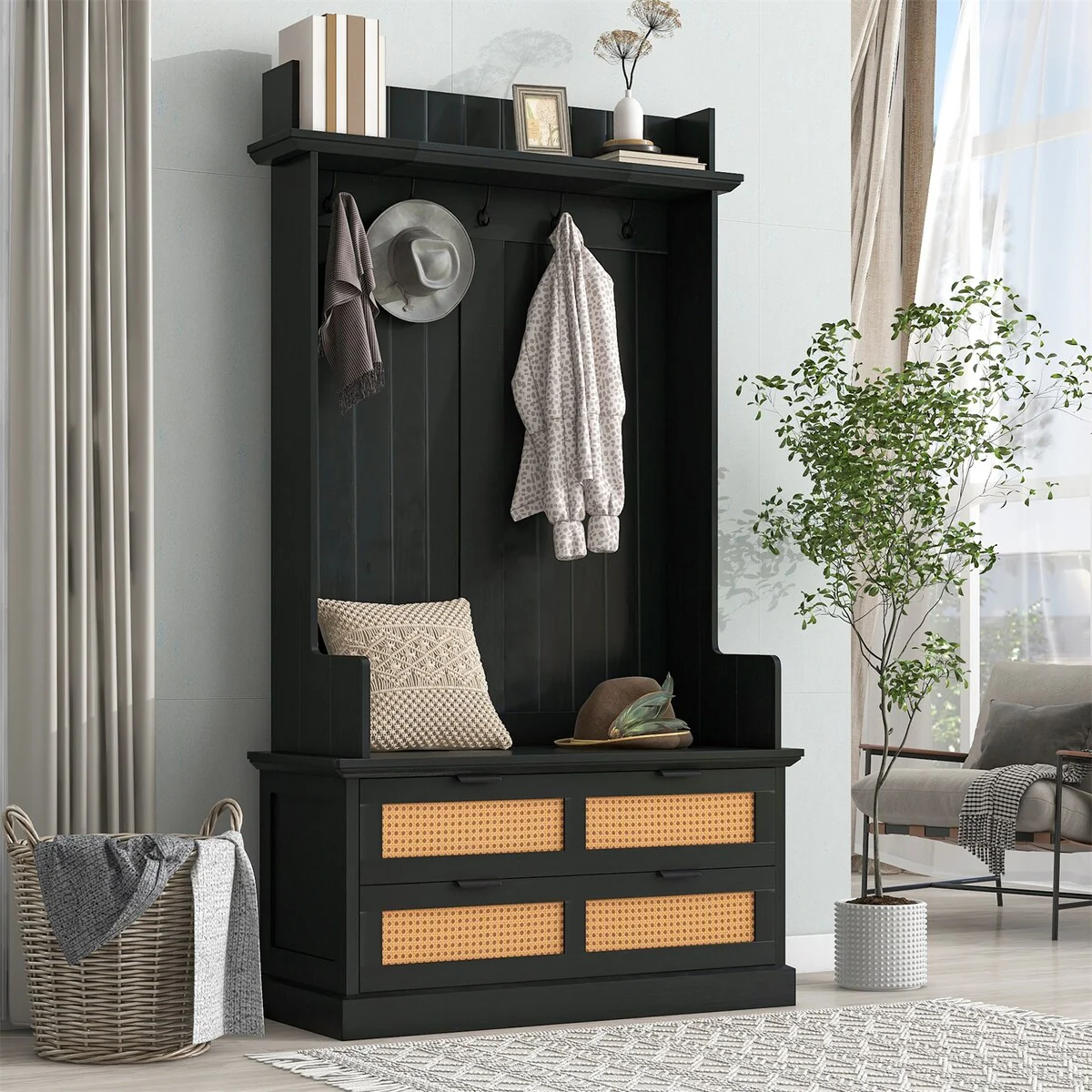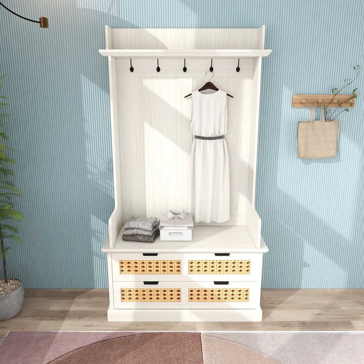 Hall Tree with 5 Metal Hooks and 2 Large Rattan Drawers