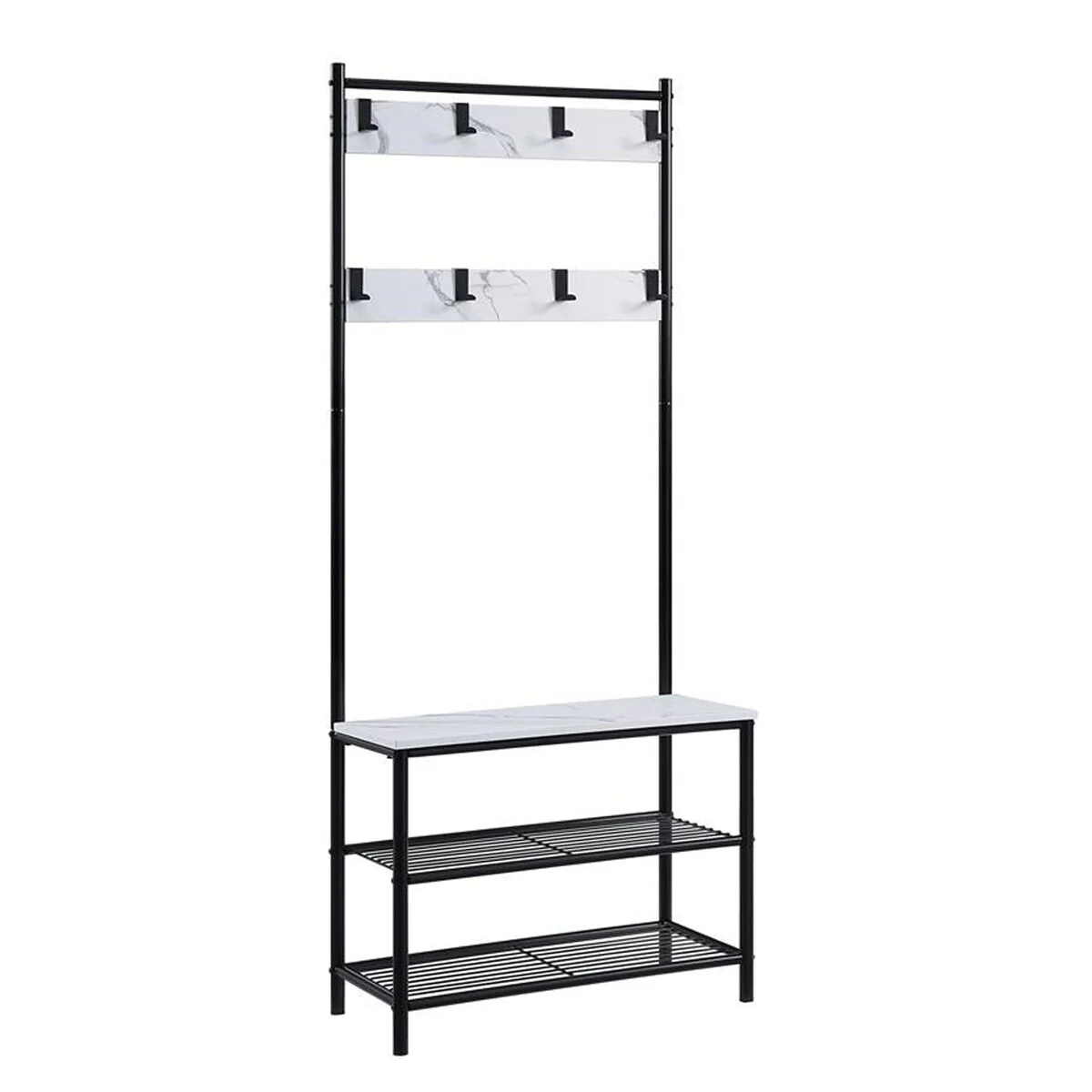 Faux Marble Hall Tree with 2 Metal Shelves, White and Black