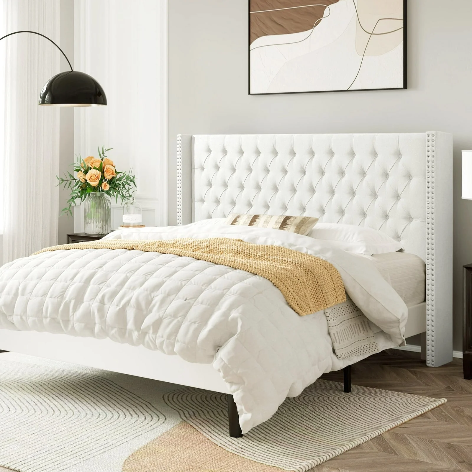 Linen Upholstered Tufted Headboard w/ Wingback and Nail Trim