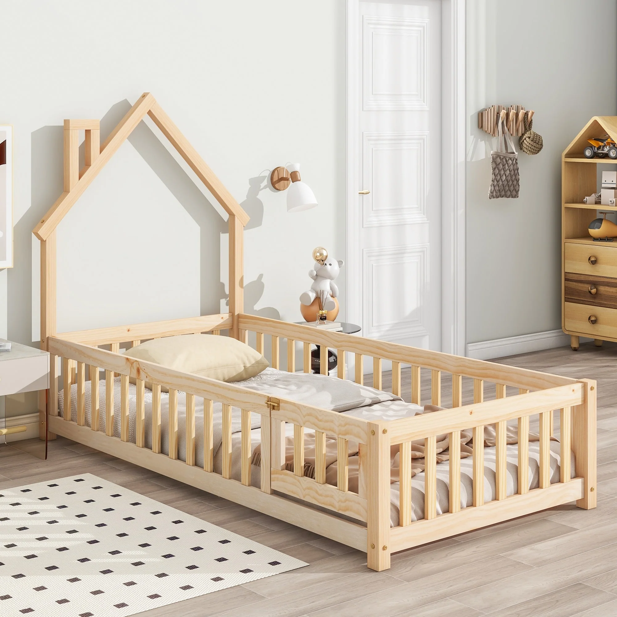 Twin Size Pine House-Shaped Floor Bed with Roof & Guardrails